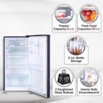 Single door refrigerator’s storage or interior description: Shelf Type- Toughened Glass with Frame / adjustable shelves; No. of shelves: 02, Fridge Vegetable box capacity- 9.6 L; Door Basket No (Full Size / Half Size) (Nos.: RL / RH): 2+3