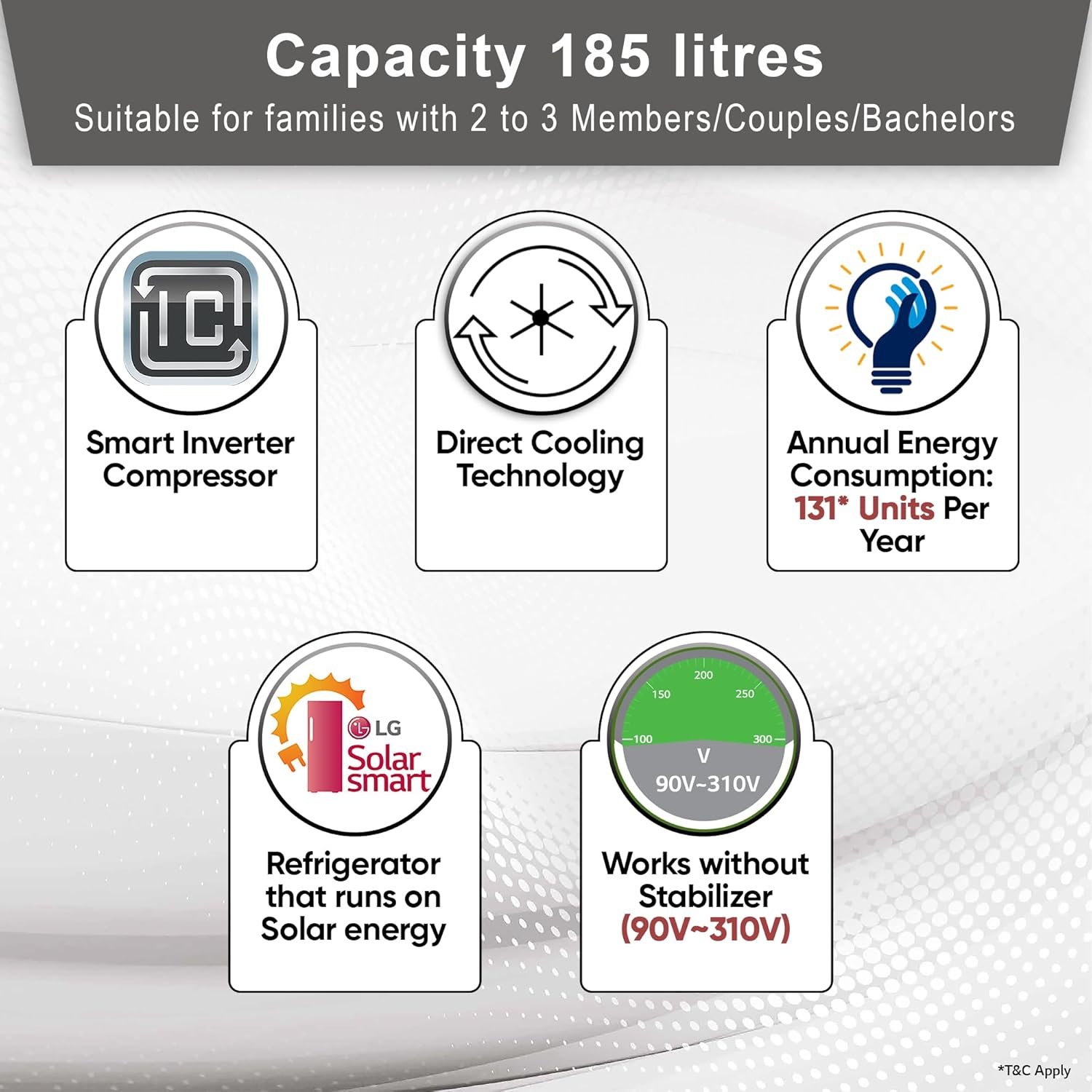 Net capacity: 185 litres: Suitable for families with 2 to 3 members | freezer capacity: 16L | fresh food capacity: 169L