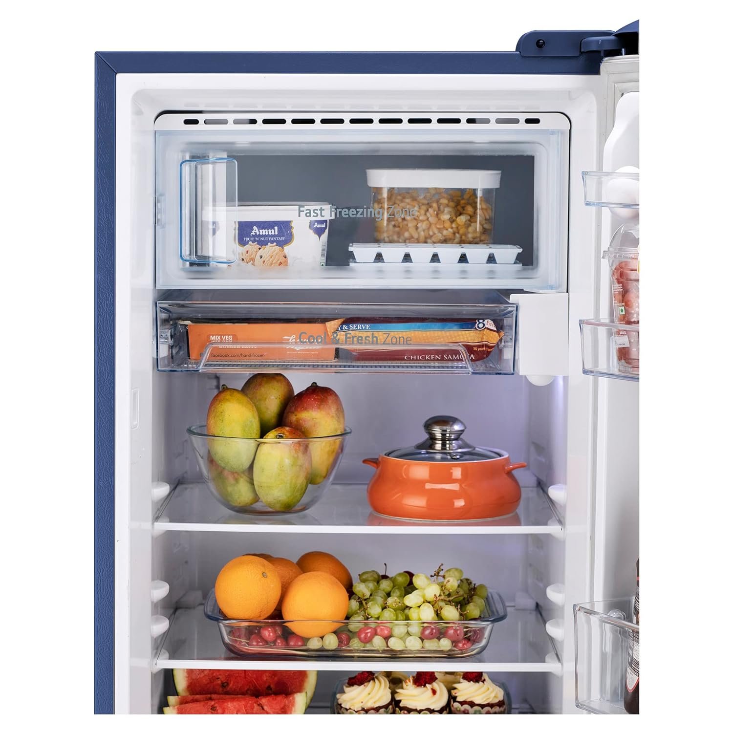 Brand specific features: Chiller- Transparent; Base stand with Drawer for additional space for non-refrigerated food items; Transparent Freezer Door; Tray Egg