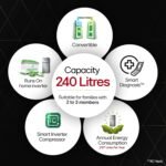 Capacity 240 ltrs: Suitable for families with 2 to 3 members I freezer capacity: 59 L; fresh food capacity (Fridge): 181 L
