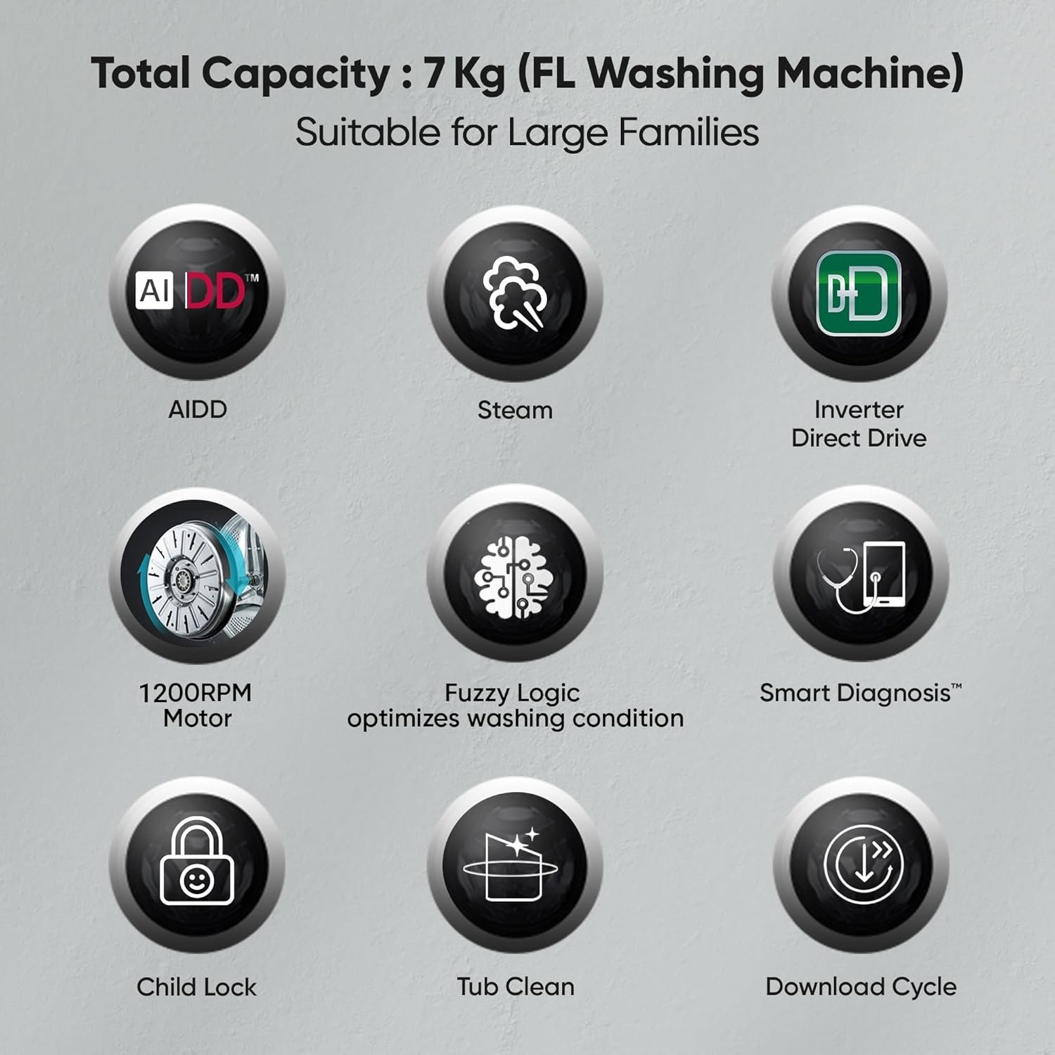Fully-automatic front load washing machine with Hygiene Steam removes allergens & AI Direct-Drive Technology: Best Wash Quality, Energy and Water efficient