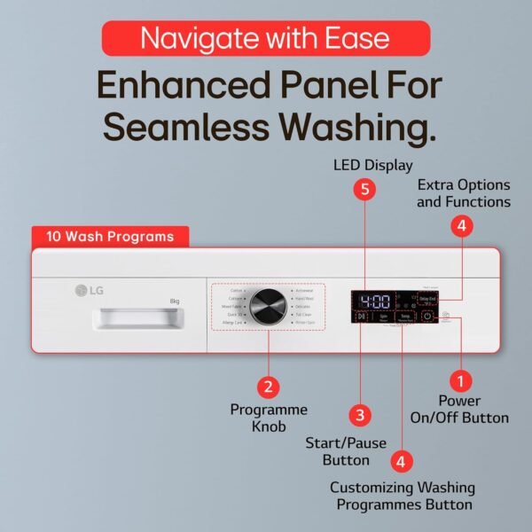 Display Type and Pressure Suitability: LED Display: Easy-to-read information about wash cycles, Power On/Off Button, Programme Knob, Start/Pause Button, Extra Options and Functions, Customizing Washing Programme Buttons, Display | Touch Panel | Jog Dial for Program selection | Pressure Suitability: 50 kPa ~ 800 kPa (0.5 ~ 8.0 kgf/cm²)