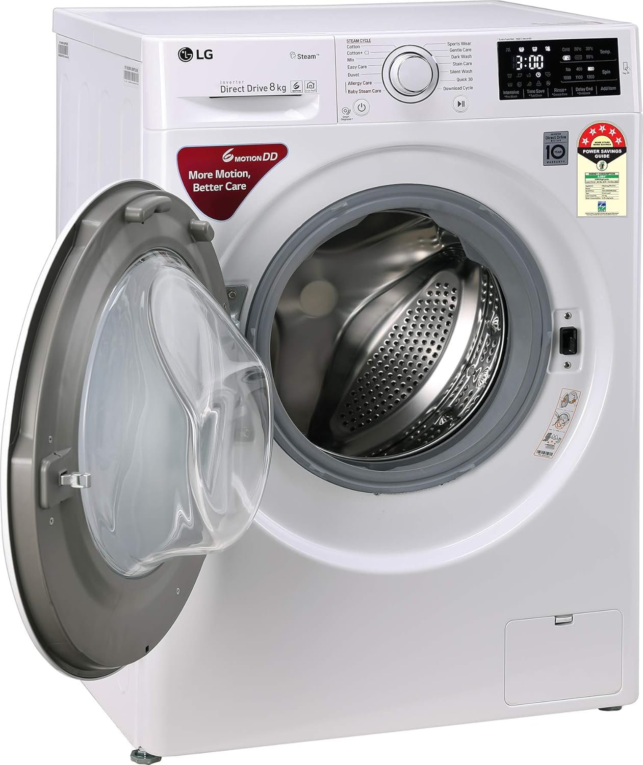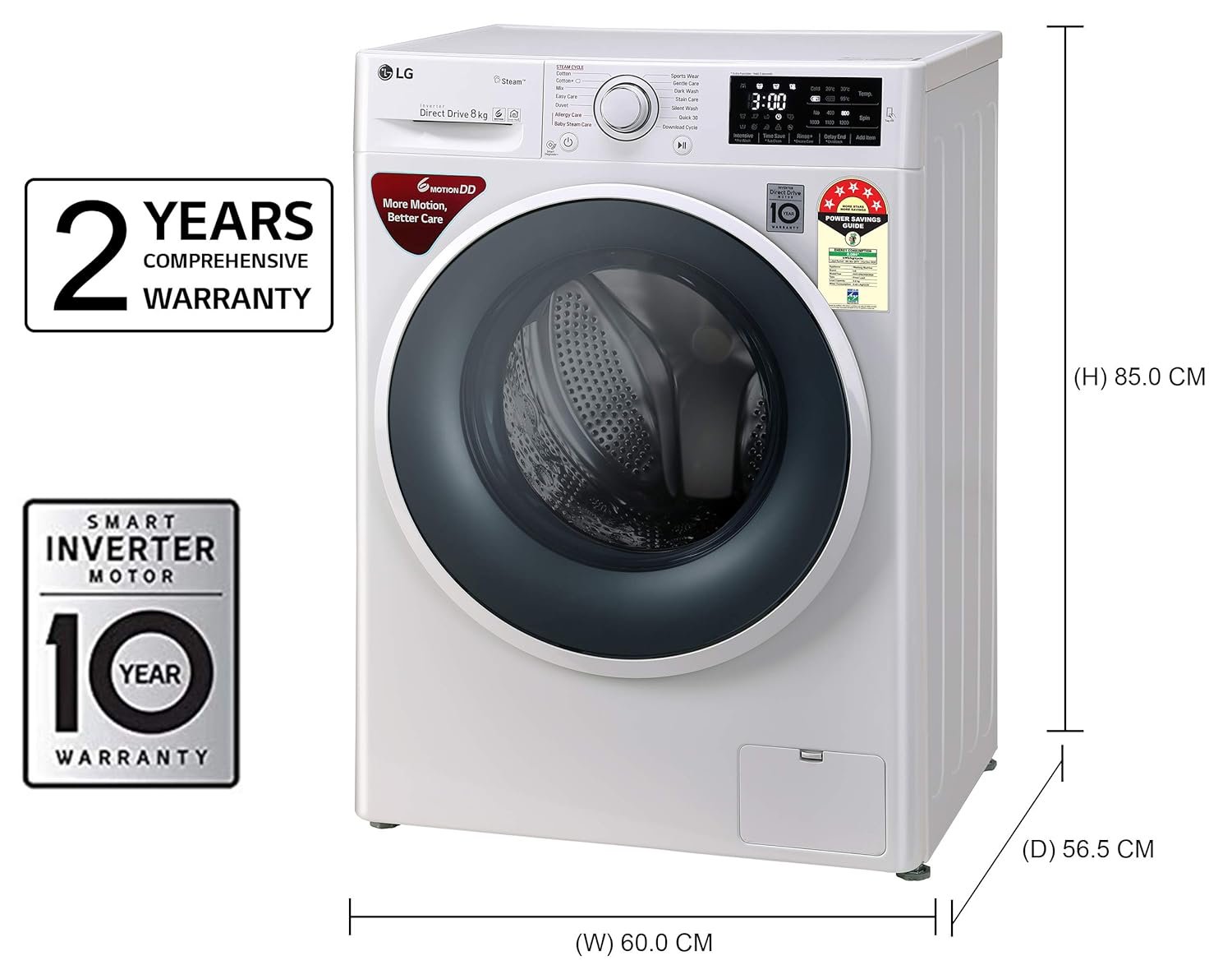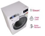 Special features: inverter direct drive motor, fast & Clean wash with 6 motions, child lock, steam for hygiene, 100% water proof touch panel, time delay, cold water inlet