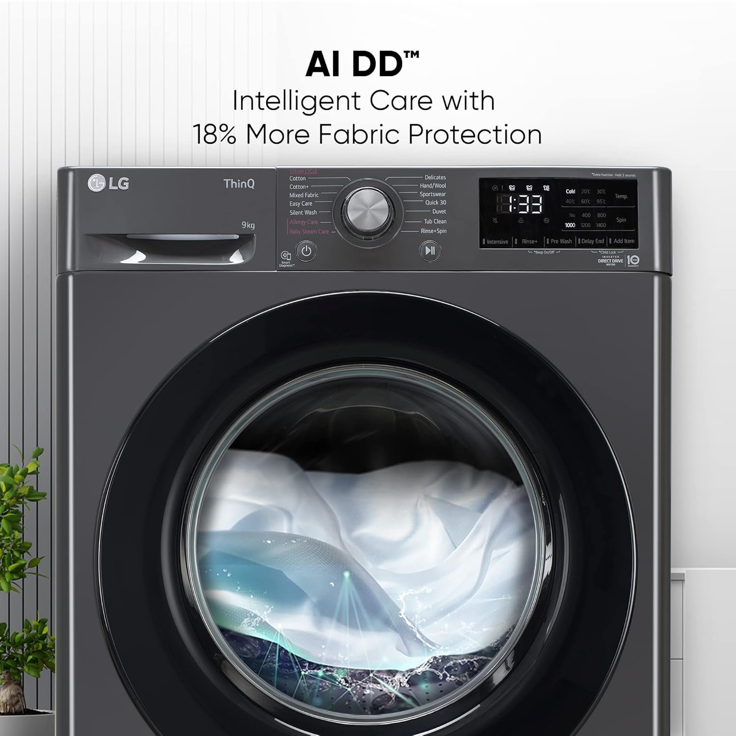 Fully-automatic front load washing machine with Hygiene Steam removes allergens & AI Direct-Drive Technology: Best Wash Quality, Energy and Water efficient