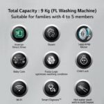 Additional Features – Smart washing machine, Auto Door, Delay Timer, Auto Restart with Memory Backup, LoadSense, Cold Water feed, Auto Water Level, Child Lock, Voltage Protection/Shock Proof, Temperature Range – Cold/20/30/40/60/95℃, Tempered Glass Door, Spin Speed option – 1400/1200/1000/800/400/No spin