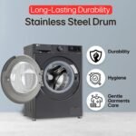 Drum / Pulsator type & Body material: Fully Stainless Steel Drum built to bring convenience and durability, which makes your washing machine last longer. Not just this, its stainless steel lifters keep the insides of the washing machine hygienic | Material & Finish – Black Steel, Door Type – Black Tinted Tempered Glass Cover