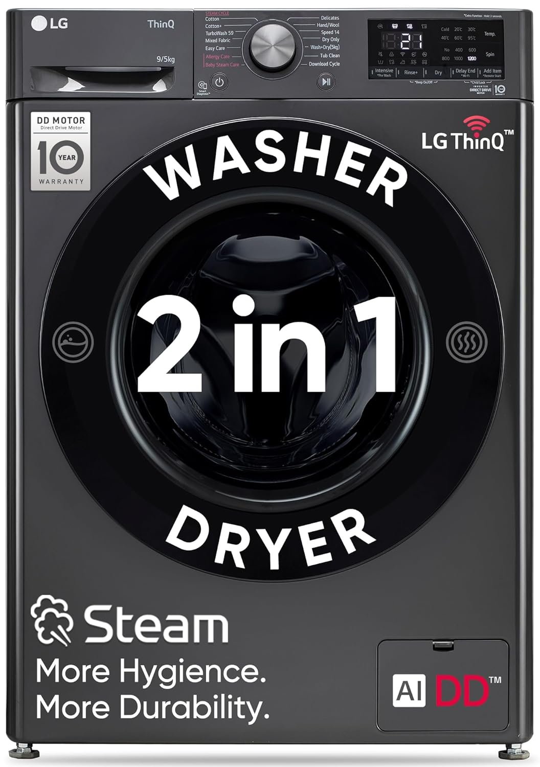 LG 9 Kg (Wash) / 5 Kg (Dry), Ai Direct Drive Technology, Steam, TurboWash & Wi-Fi Fully Automatic Front Load Washer Dryer (FHD0905SWM, Intelligent & Convenient Fabric Care, Allergy Care, Middle Black)
