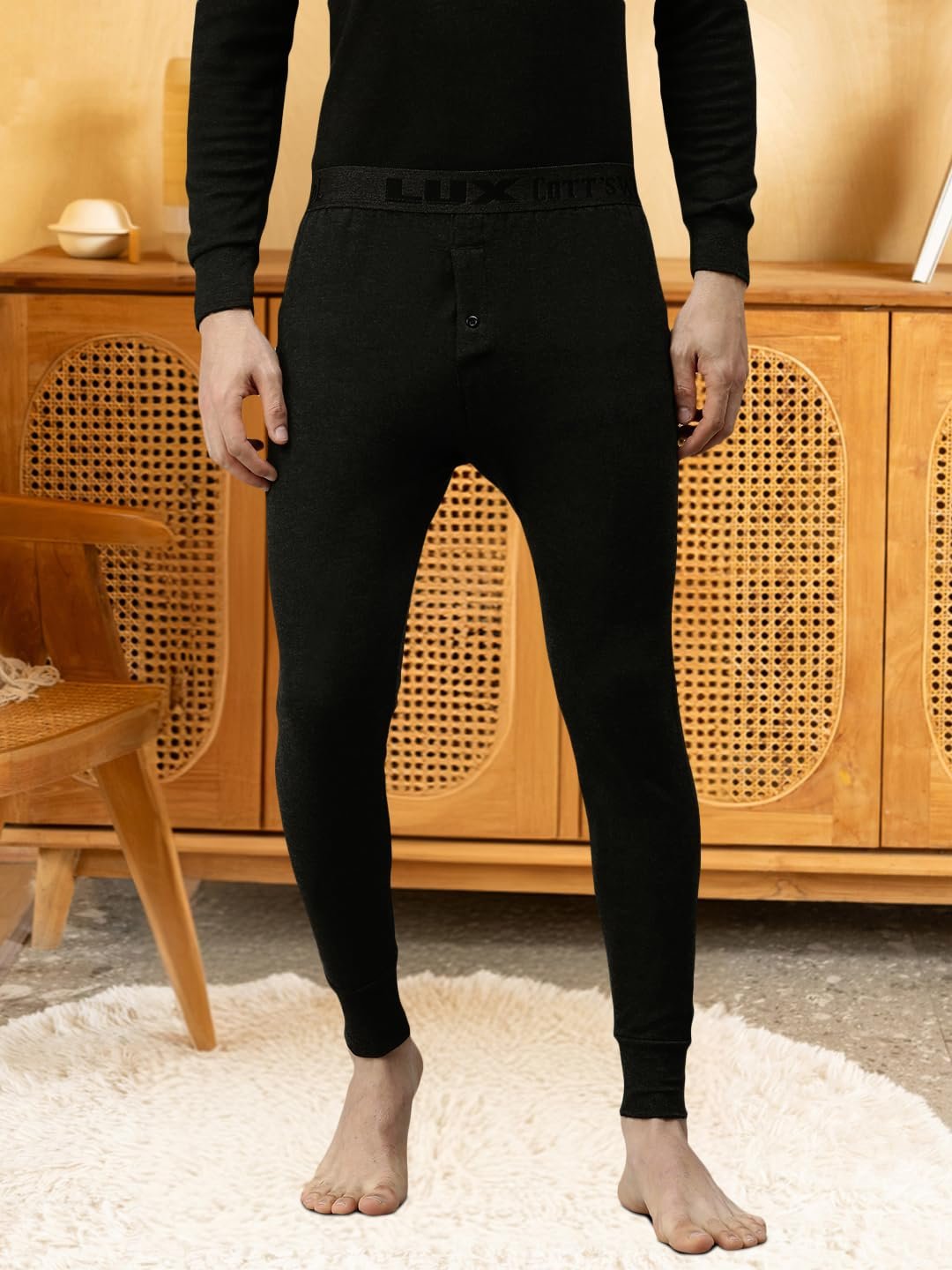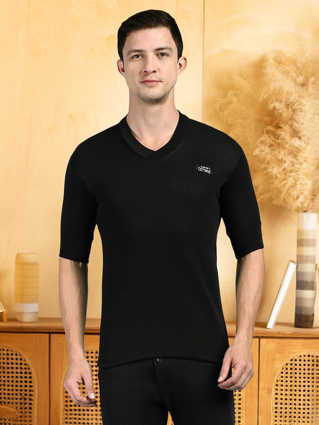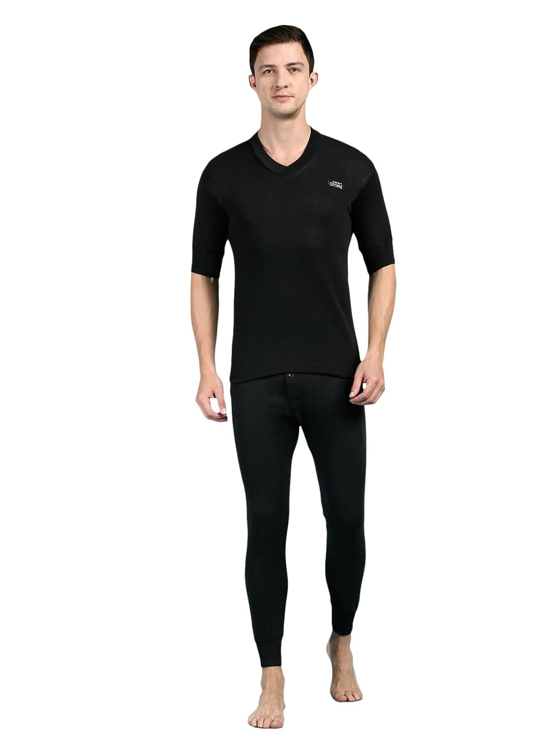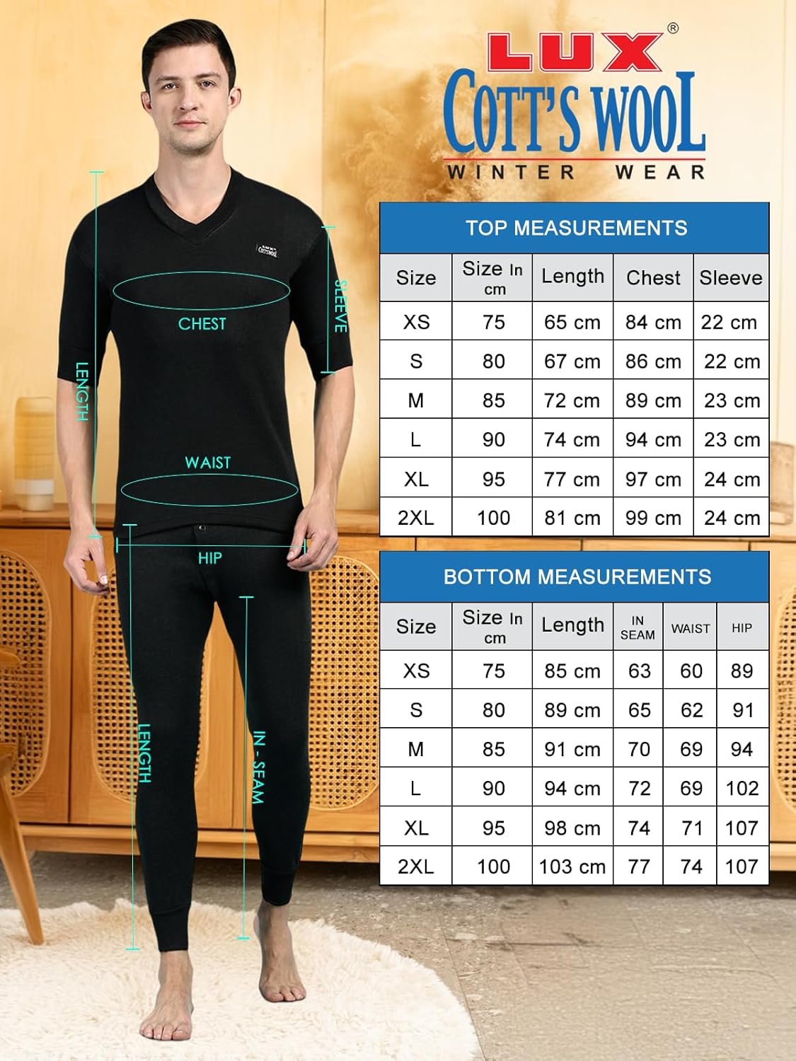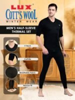 Lux Cott’sWool V neck Half Sleeves Thermal Set. A body-hugging thermal wear for icy days and chili nights Made from exceptional soft cotton, processed to draw moisture away Designed to be worn as underpants Available in Front open bottom for extra comfort. XS=75cm, S=80cm, M=85cm, L=90cm, XL=95cm, XXL=100cm,