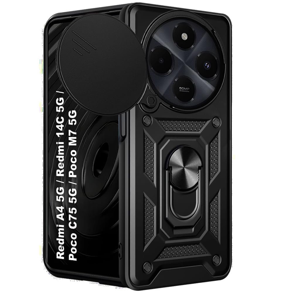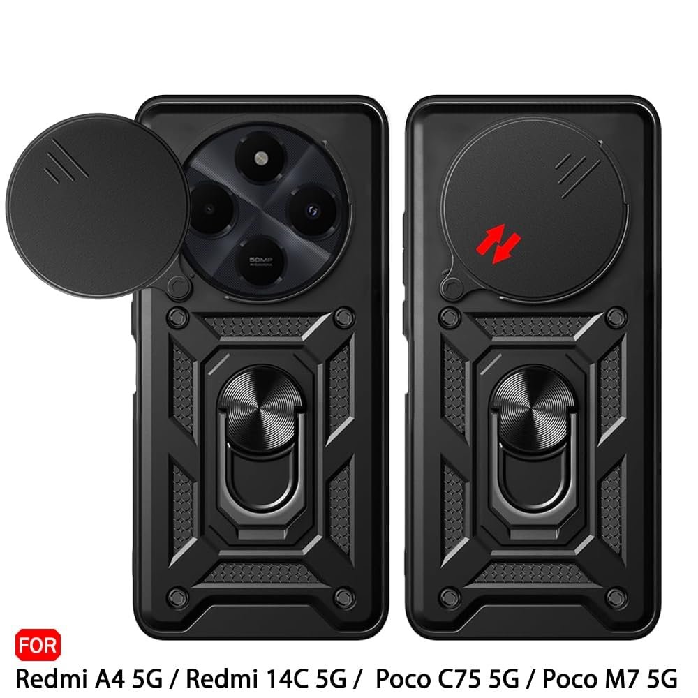 Luxe® Back Cover for Poco M7 5G / Redmi 14C 5G / Redmi A4 5G / Poco C75 5G | D10 Tough Armor Case | Sliding Camera Shield | 360° Protection | Kickstand Ring Holder | Military-Grade Shockproof