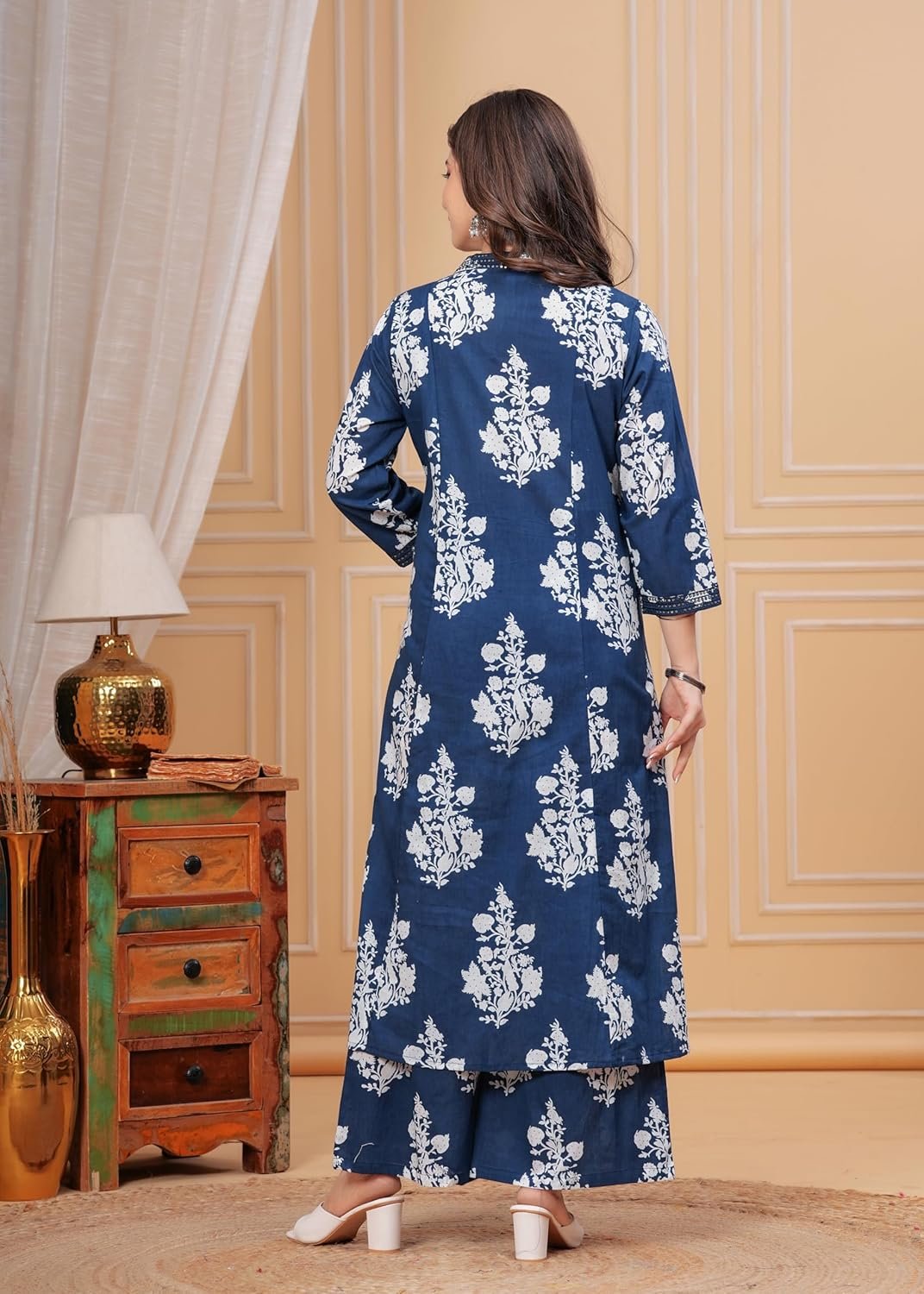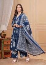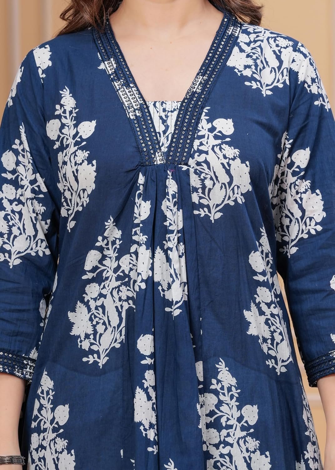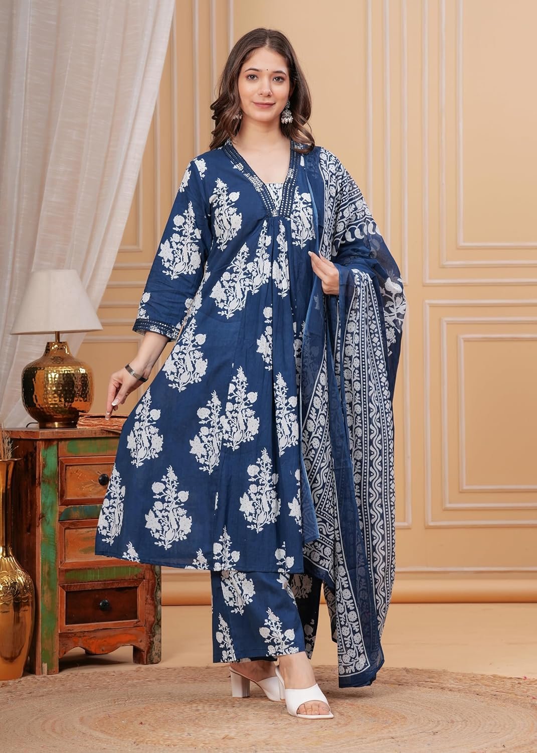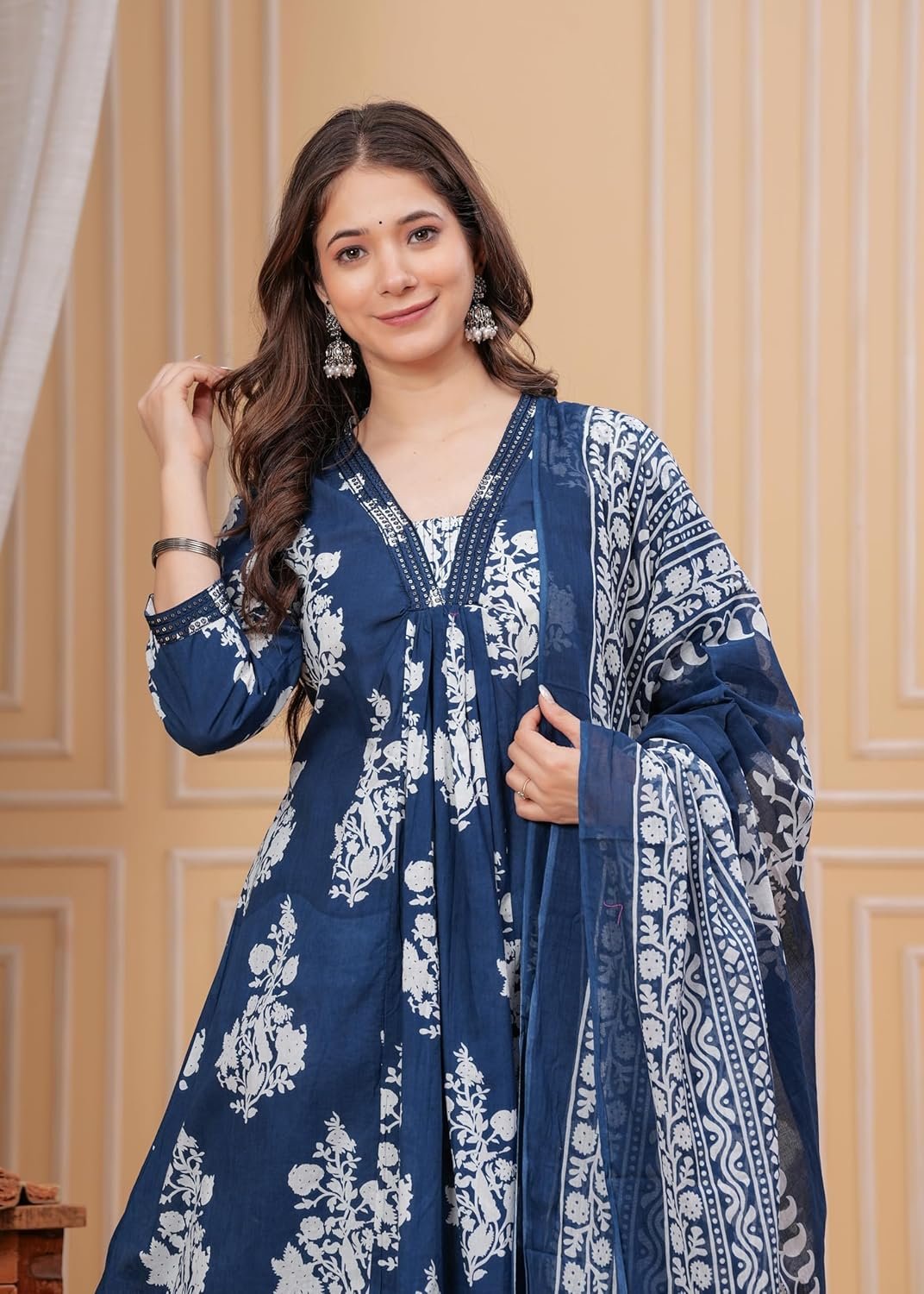 MEERA FAB Women’s Cotton Blend V-Neck Anarkali Embrodriery Kurta with Palazzo & Dupatta