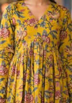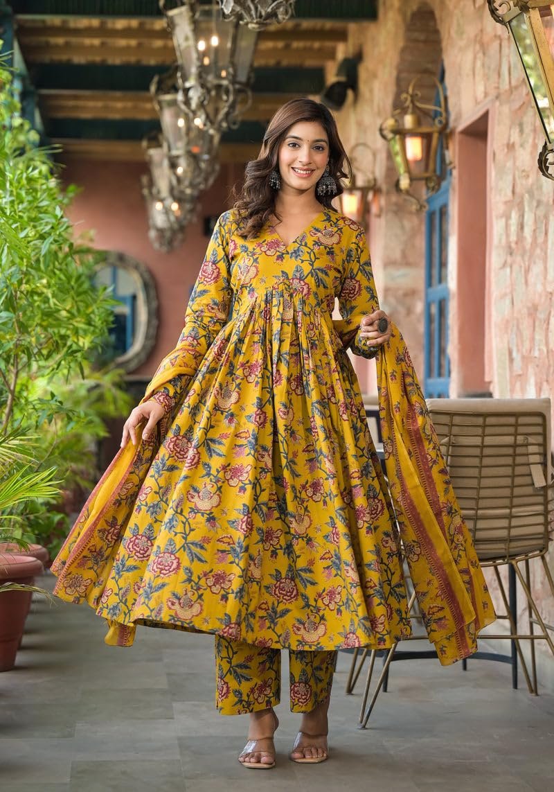MEERA FAB Women’s Cotton Blend V-Neck Anarkali Printed Kurta with Palazzo & Dupatta