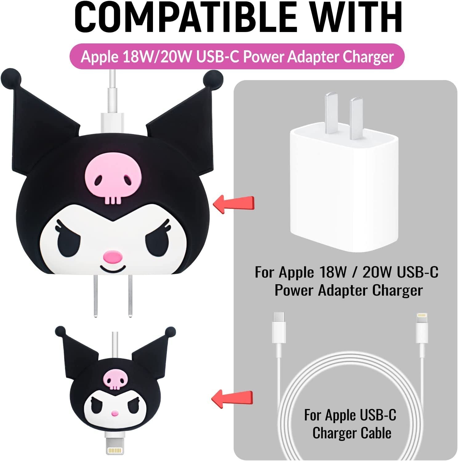 Product Description: Meyaar Compatible With Apple 20W & 18W USB-C Power Adapter Charger Cute Cartoon Designs Protective Case,Cute Cartoon Cable Protector Cover for iPhone Charger. Durable material: PVC plastic, Silicone. Function: anti-fall, Shockproof,reducing wear and breakage, and prevents charging cable from disconnect. Package includes: 1pcs Protector Case for iPhone power adapter . 1pcs Protector Case for iPhone power cable. (The iPhone USB Cable and Charger are not included). NOTE: 1.The Protector Cases are suitable for iphone/ipad original power adapter and USB charger cables, other phone power adapter and USB cable may not be applicable. 2.Please kindly keep the cable protectoraway from heating devices and fire.