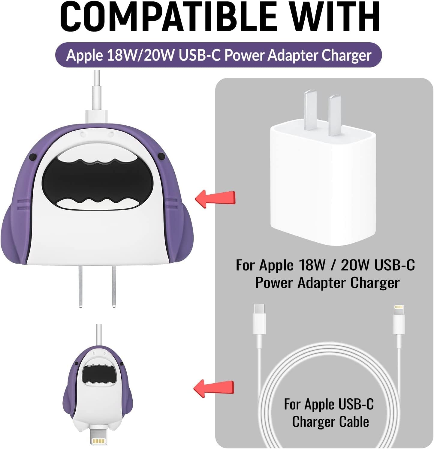 Product Description: Meyaar Compatible With Apple 20W & 18W USB-C Power Adapter Charger Cute Cartoon Designs Protective Case,Cute Cartoon Cable Protector Cover for iPhone Charger. Durable material: PVC plastic, Silicone. Function: anti-fall, Shockproof,reducing wear and breakage, and prevents charging cable from disconnect. Package includes: 1pcs Protector Case for iPhone power adapter . 1pcs Protector Case for iPhone power cable. (The iPhone USB Cable and Charger are not included). NOTE: 1.The Protector Cases are suitable for iphone/ipad original power adapter and USB charger cables, other phone power adapter and USB cable may not be applicable. 2.Please kindly keep the cable protectoraway from heating devices and fire.