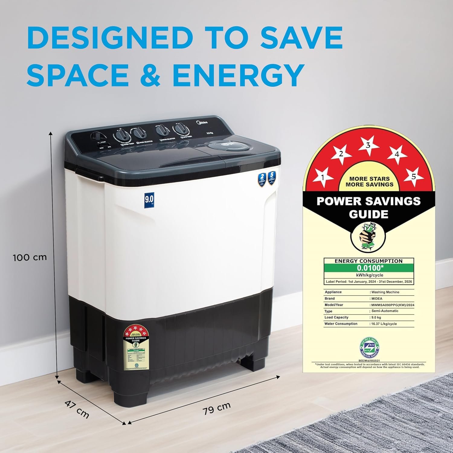 Midea 9 Kg 5 Star Air Jet Dry IPX4 Protection Semi Automatic Top-Load Washing Machine (MWMSA090SAPPG(KG)2024) Black White