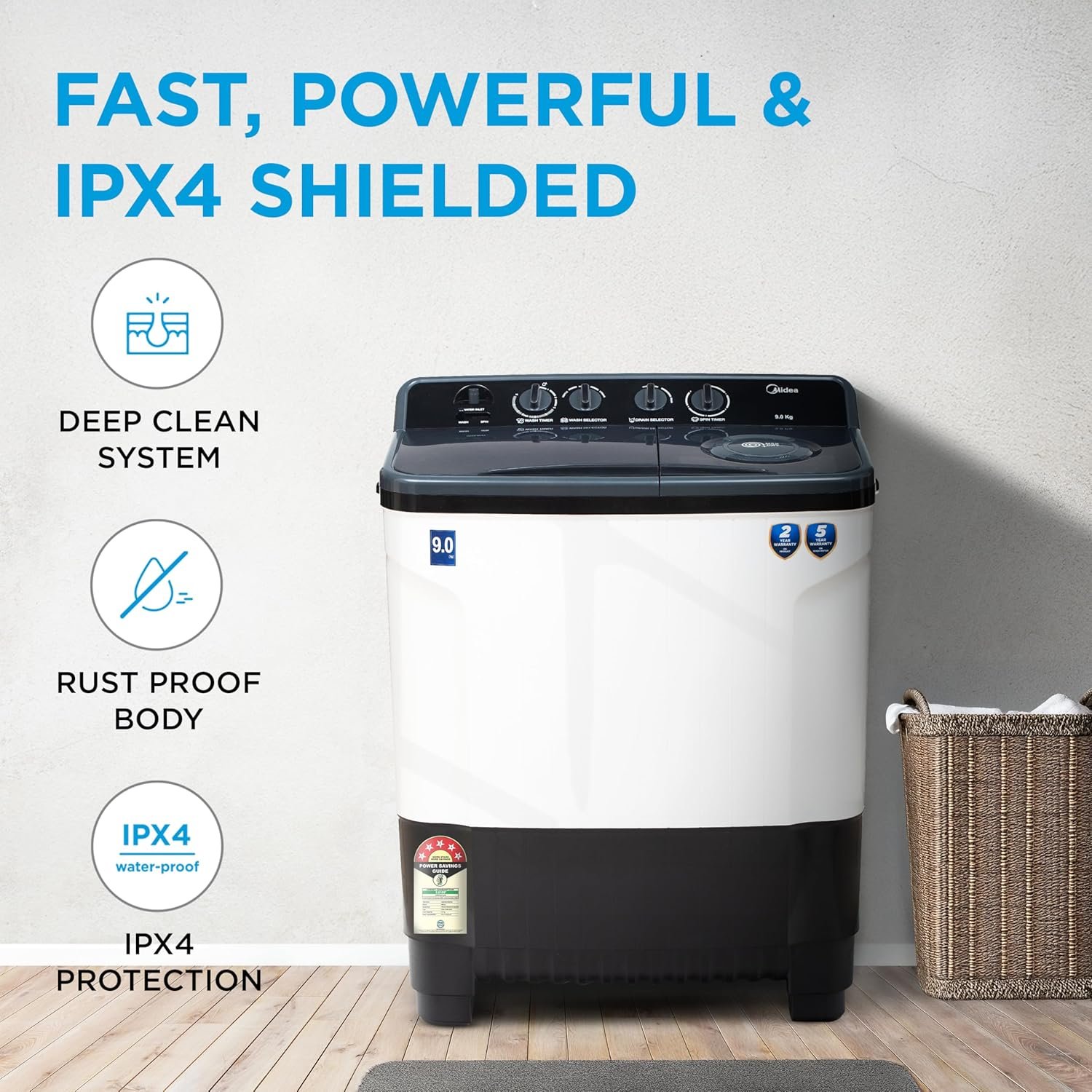 7. Rust-Proof Body with IPX4 Protection: Built with a rust-proof body and IPX4 water resistance, the machine withstands humidity and water splashes, making it suitable for Indian households and long-term use in utility areas.