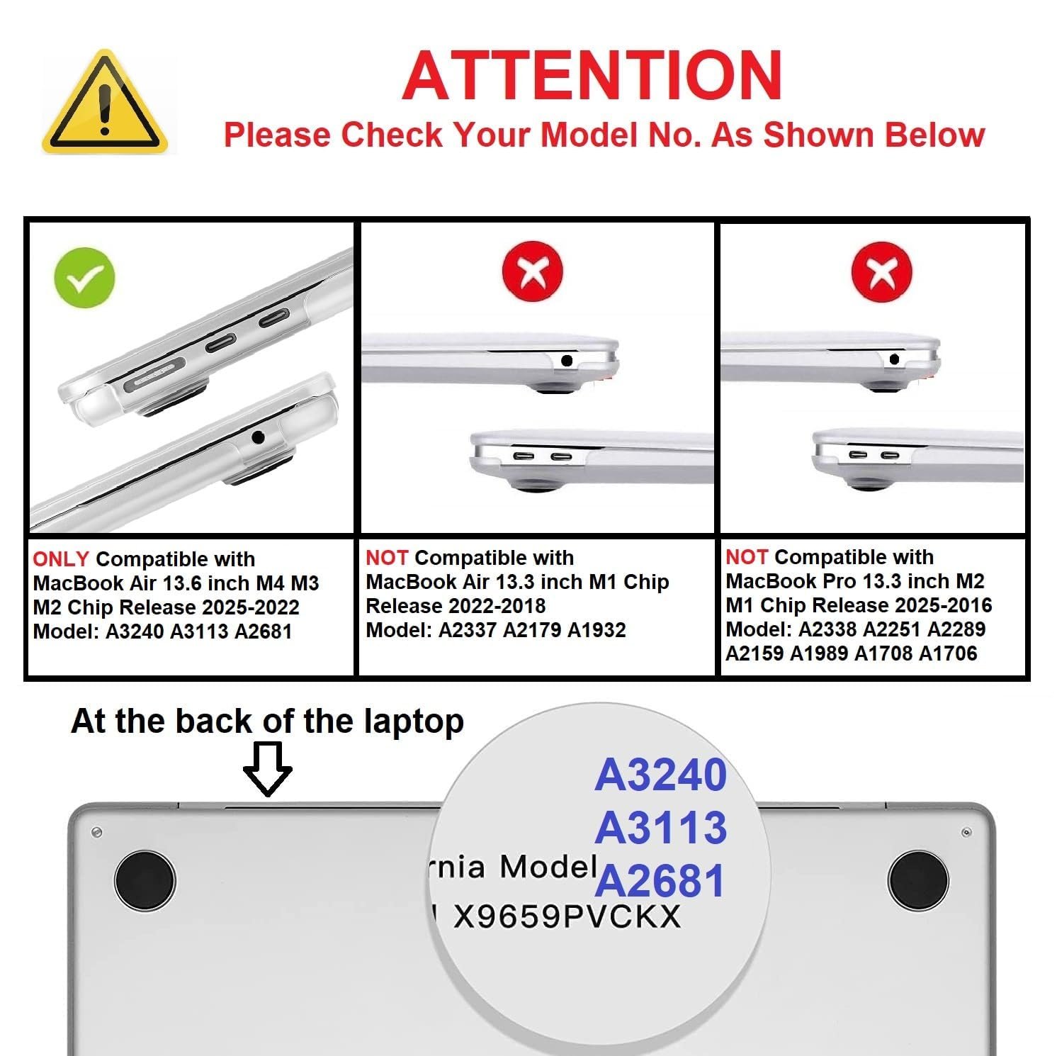Perfect Fit: The case is designed only to be compatible with MacBook Air 13.6 Inch M4 M3 M2 Chip with Liquid Retina Display & Touch ID — Model A3240 A3113 A2681 — Release 2025 2024 2023 2022 — MC6T4LL/A, MW123LL/A, MW0W3LL/A, MW0Y3LL/A, MW103LL/A, MW0X3LL/A, MW133LL/A, MC6U4LL/A, MC6V4LL/A, MC6C4LL/A, MC654LL/A, MC6A4LL/A, MRXV3LL/A, MRXQ3LL/A, MRXN3LL/A, MRXT3LL/A, MXCV3LL/A, MXCT3LL/A, MXCR3LL/A, MXCU3LL/A, MLXW3LL/A, MLXX3LL/A, MLXY3LL/A, MLY03LL/A, MLY13LL/A, MLY23LL/A, MLY33LL/A, MLY43LL/A. WARNING: This case is NOT compatible with other laptop models