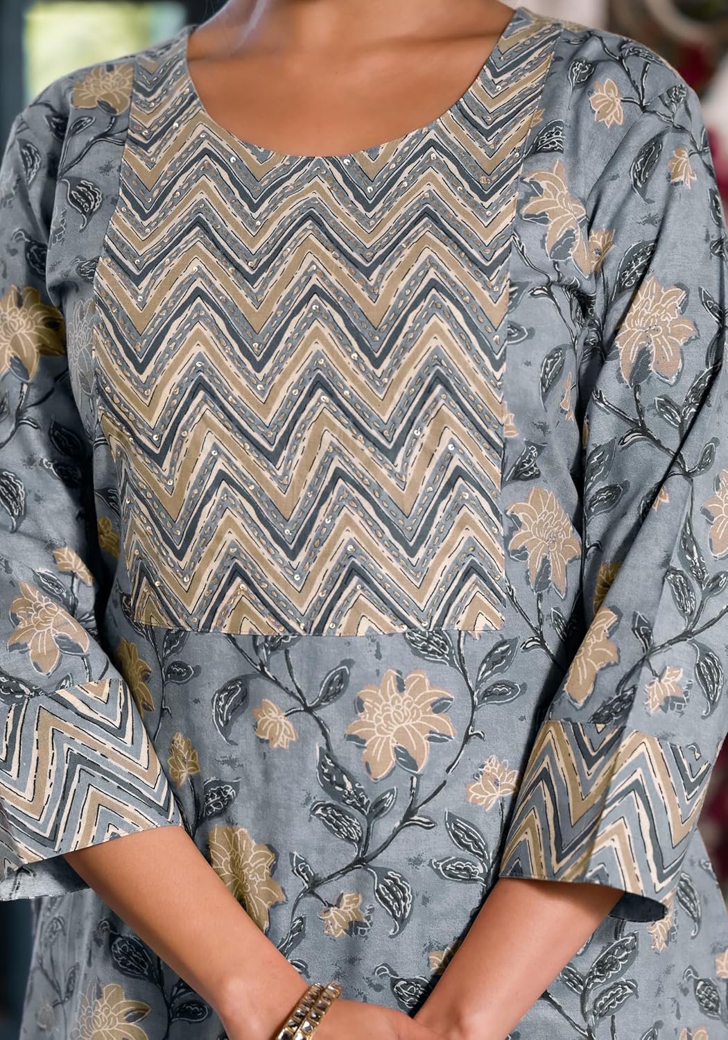 Neck style:: V Neck (Yoke Design: Sequins Thread Work),