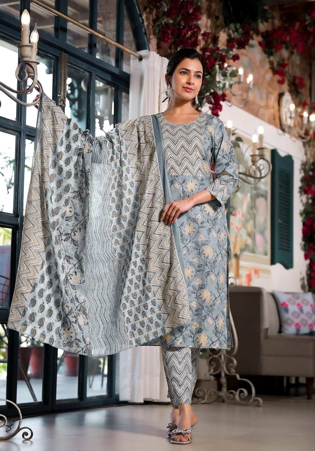 MIRCHI FASHION Women’s Straight Fit Pure Cotton Jaipuri Floral Printed Sequins Thread Work Kurta Set with Dupatta and Trouser