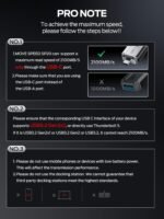 【Pro Note】– The maximum reading of USB C is 2100MB/s, and that of USB A is 1000MB/s. — Please use the USB3.2 Gen2x2 interface or Thunderbolt 5 interface, and your device must support high speed. For example, iPhone 15pro. Please do not use the docking station, as the speed depends on the interface with the lowest reading.