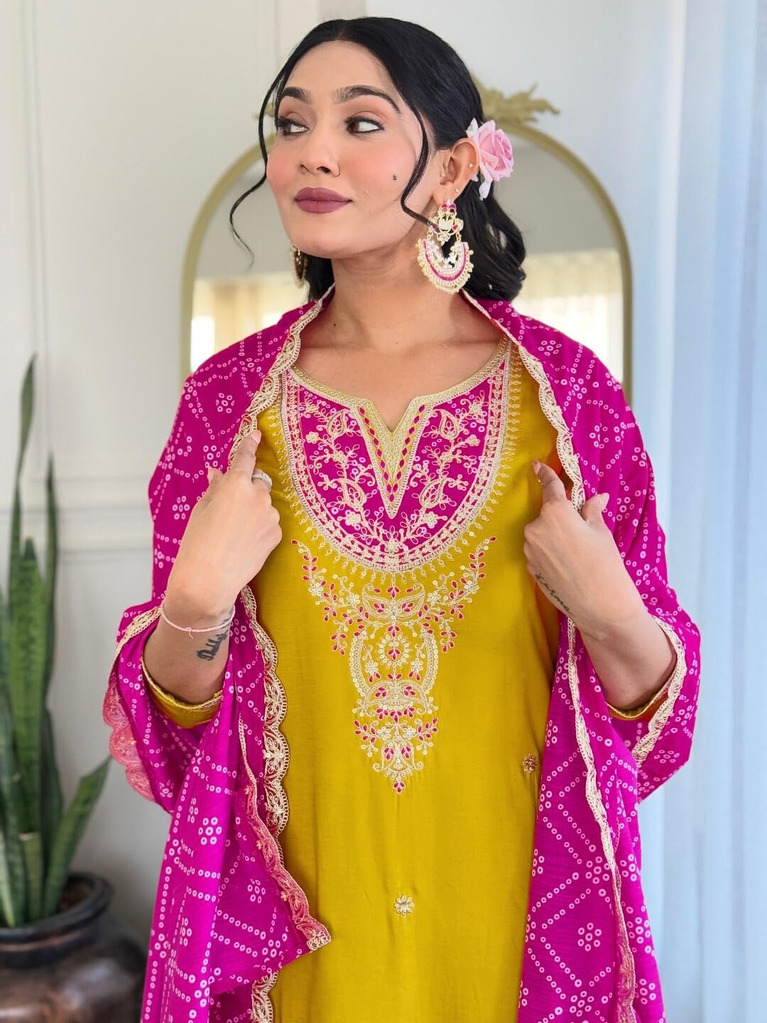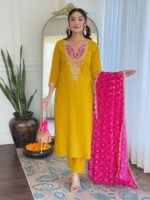 Kurta Fabric:- BSY Viscose || Bottom Fabric:- BSY Viscose || Dupatta Fabric:- Silk BlendKurta Work:- Embroidered || Dupatta Work:- Embroidered LacedPackage Contains:- 1 Set : KURTA, PANT AND DUPATTAFor the best fit, please refer to our size guide. If you’re between sizes or unsure, we recommend choosing the next larger size.