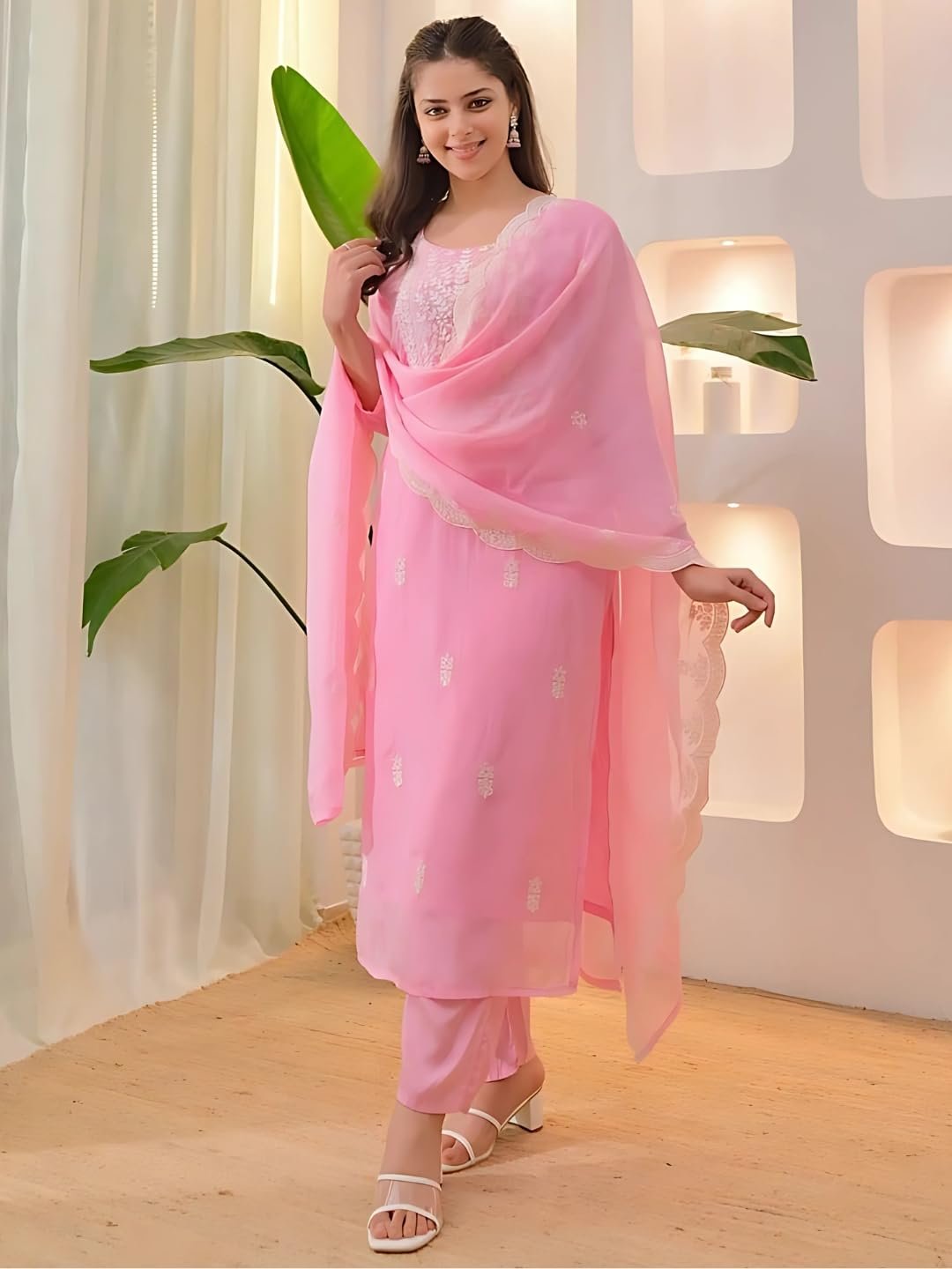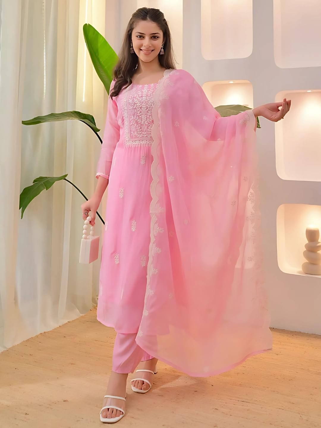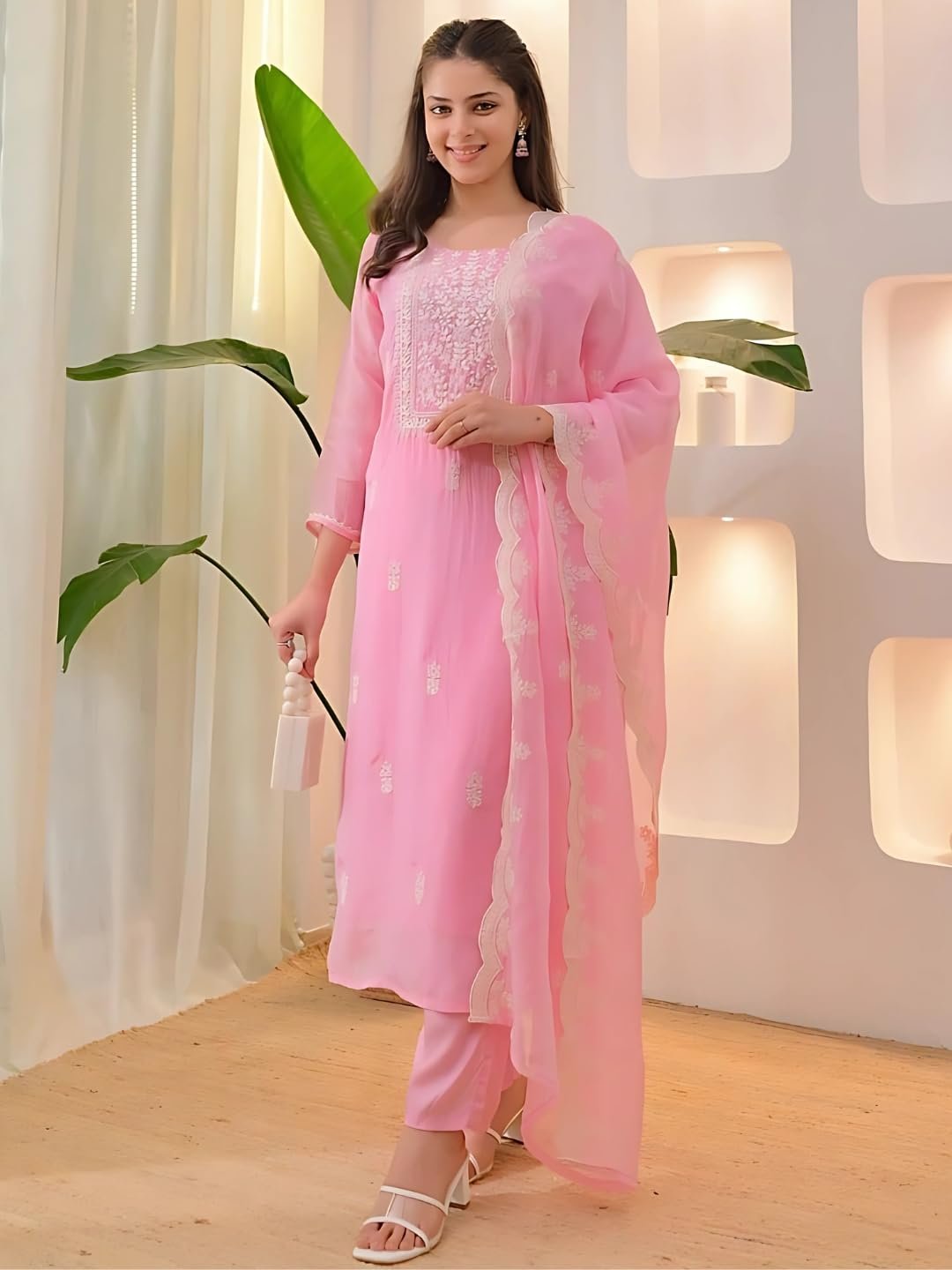 Naixa Women’s Silk Blend Embroidered Lakhnavi Work Straight Kurta with Pant And Dupatta Sets (NX-M-Morni)