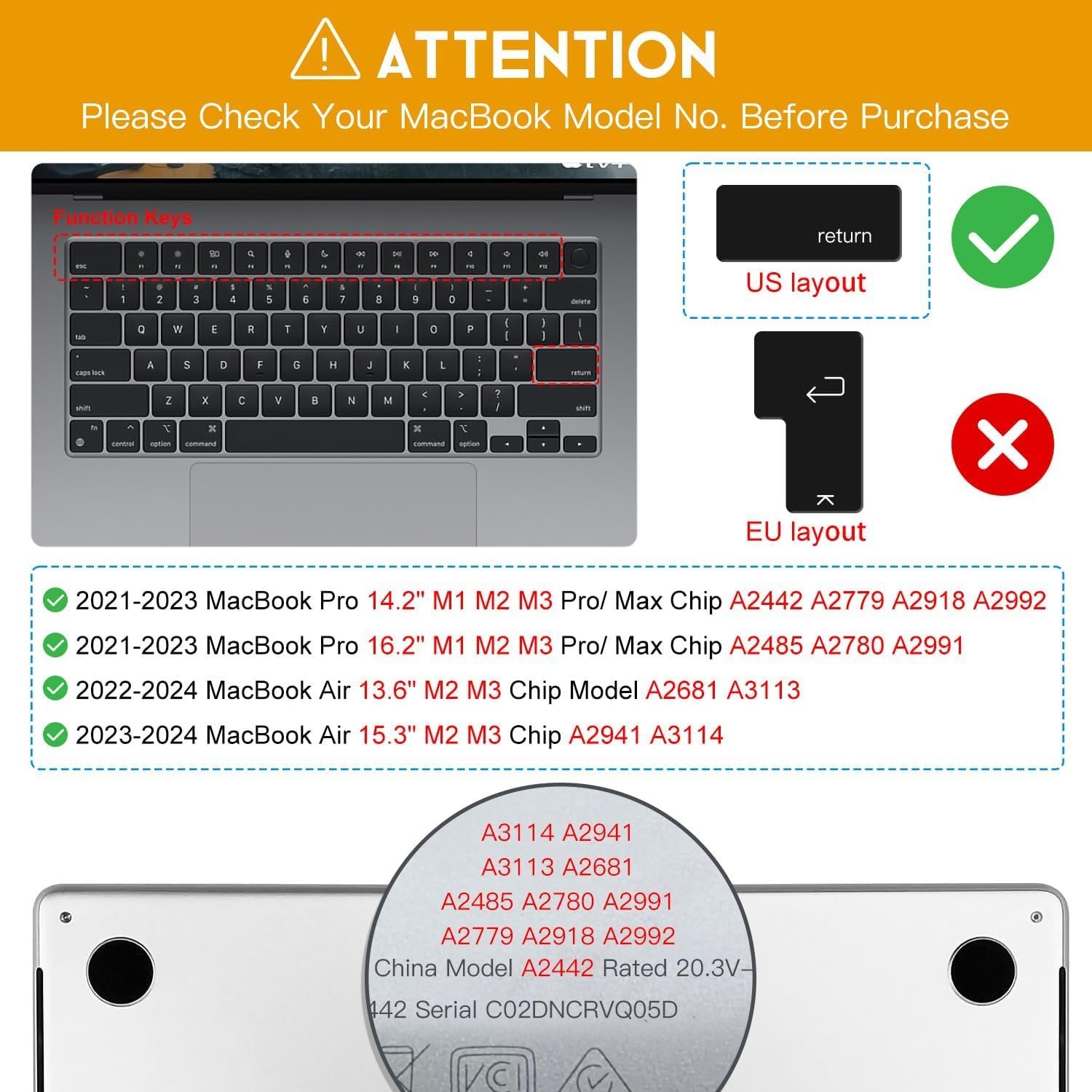 ✅[𝐂𝐨𝐦𝐩𝐚𝐭𝐢𝐛𝐢𝐥𝐢𝐭𝐲] : – This keyboard cover is specially designed for 2025-2021 MacBook Air 13 inch M4 M3 M2 Chip [𝗔𝟯𝟮𝟰𝟬 𝗔𝟯𝟭𝟭𝟯 𝗔𝟮𝟲𝟴𝟭] & MacBook Air 15 inch 2025-2021 M4 M3 M2 Chip [𝗔𝟯𝟮𝟰𝟭 𝗔𝟯𝟭𝟭𝟰 𝗔𝟮𝟵𝟰𝟭] . US Layout. ⚠️⚠️⚠️ 𝐏𝐥𝐞𝐚𝐬𝐞 𝐜𝐡𝐞𝐜𝐤 𝐲𝐨𝐮𝐫 𝐌𝐚𝐜𝐛𝐨𝐨𝐤’𝐬 𝐦𝐨𝐝𝐞𝐥 𝐧𝐮𝐦𝐛𝐞𝐫 “𝐀𝐱𝐱𝐱𝐱” 𝐨𝐧 𝐭𝐡𝐞 𝐛𝐨𝐭𝐭𝐨𝐦 𝐨𝐟 𝐭𝐡𝐞 𝐥𝐚𝐩𝐭𝐨𝐩 𝐚𝐧𝐝 𝐜𝐨𝐦𝐩𝐚𝐫𝐞 𝐘𝐨𝐮𝐫 𝐤𝐞𝐲𝐛𝐨𝐚𝐫𝐝 𝐥𝐚𝐲𝐨𝐮𝐭 𝐰𝐢𝐭𝐡 𝐩𝐫𝐨𝐝𝐮𝐜𝐭 𝐢𝐦𝐚𝐠𝐞.