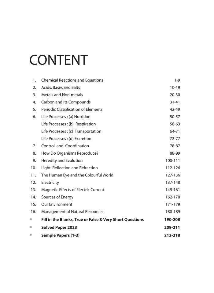 Chemical Reactions and Equations, Acids, Bases and Salts, Metals and Non-Metals, Carbon and Its Compounds, Periodic Classification of Elements, Life Processes: a) Nutrition b) Respiration c) Transportation d) Excretion, Control and Coordination, How Do Organisms Reproduce? Heredity and Evolution, Light: Reflection and Refraction, The Human Eye and the Colourful World, Electricity, Magnetic Effects of Electric Current, Sources of Energy, Our Environment, Management of Natural Resources, Fill in the Blanks, True or False & Very Short Questions, Exam Paper 2023, Sample Papers (1-3)