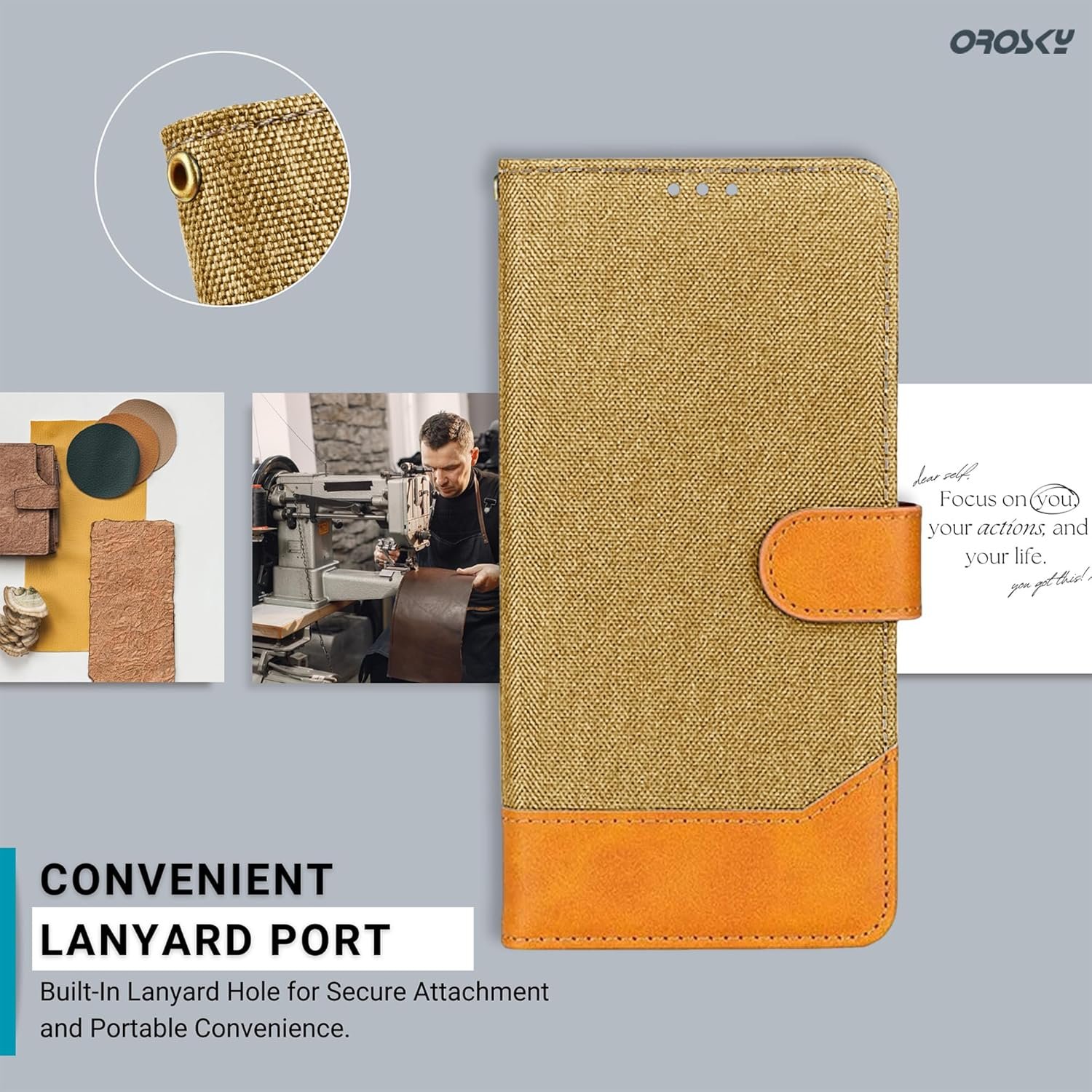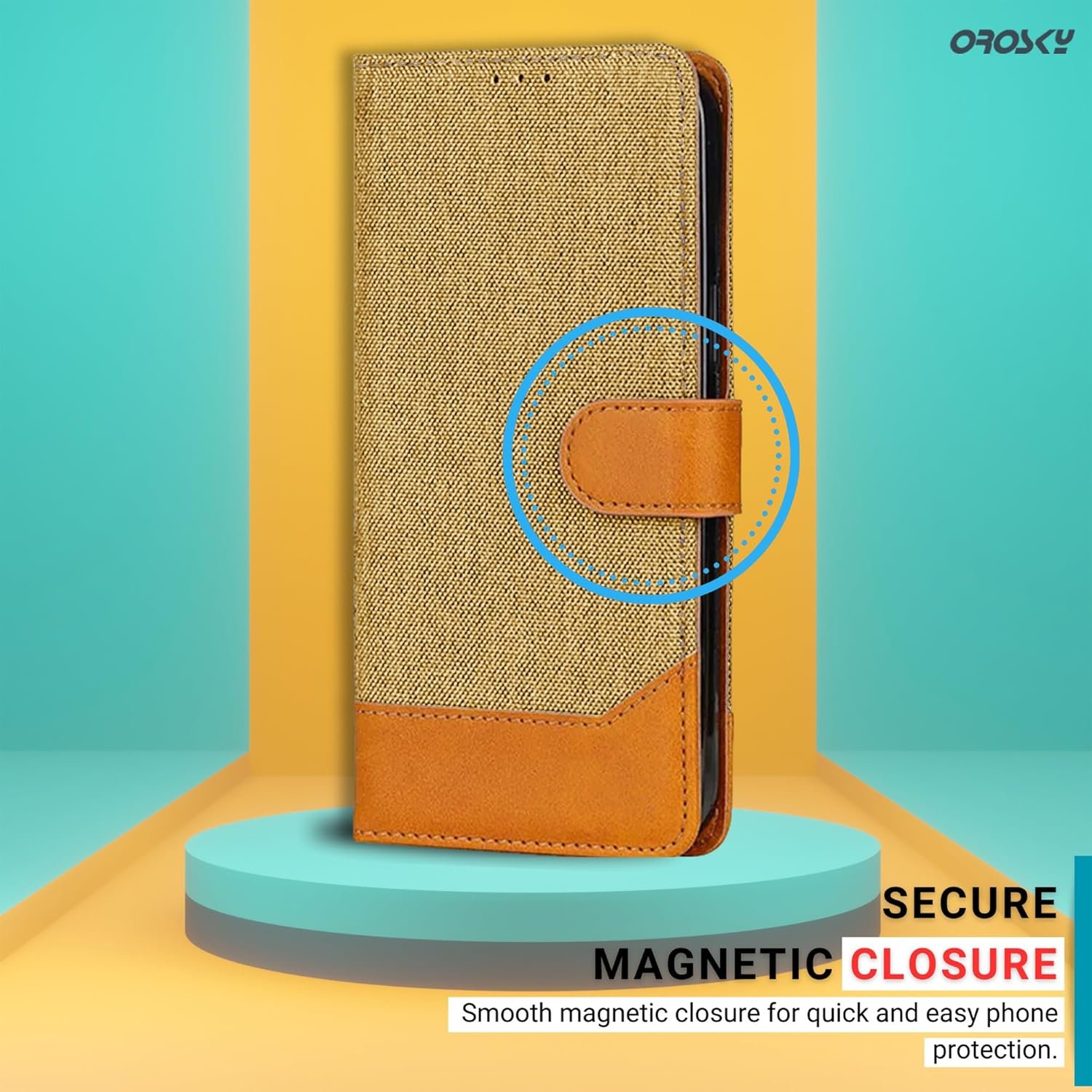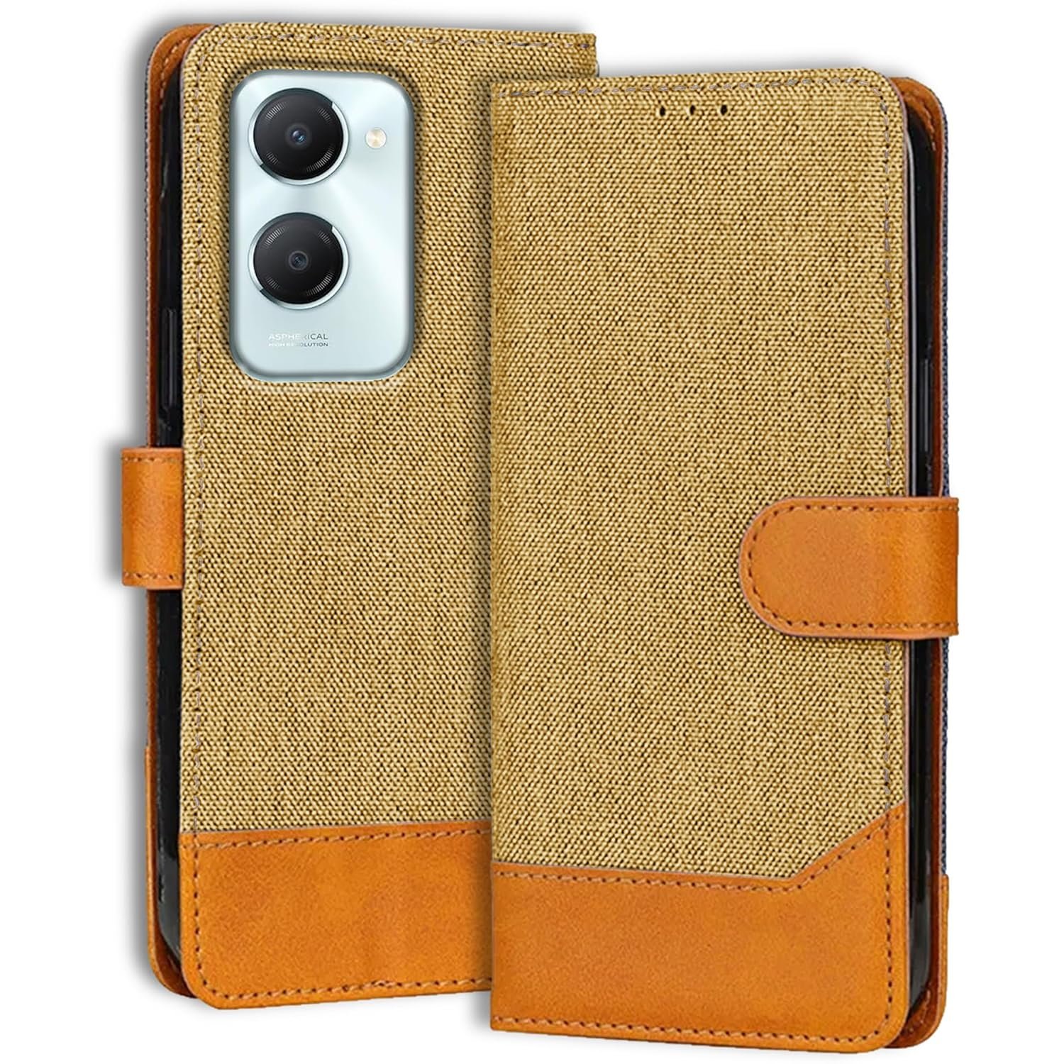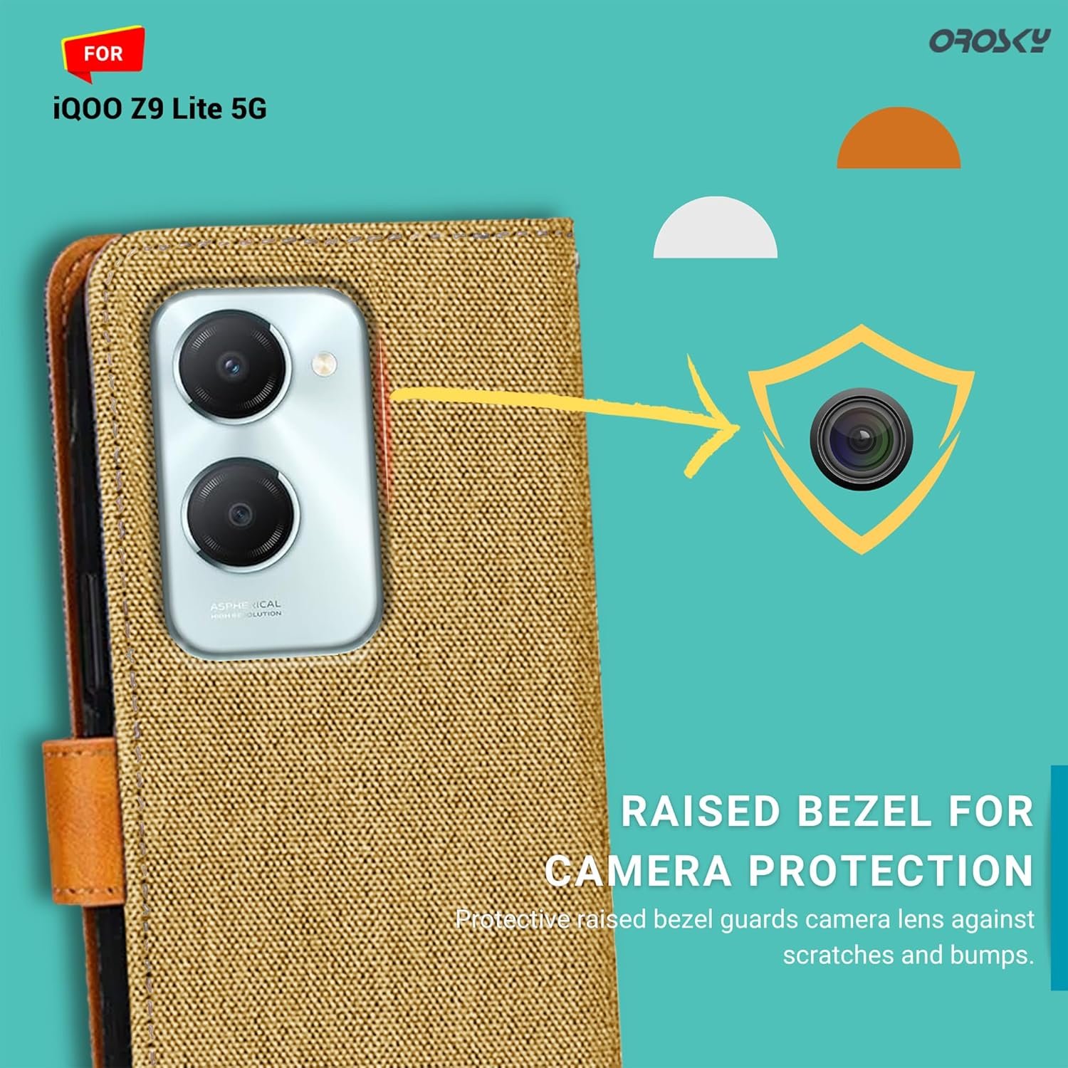 Orosky Flip Cover for iQOO Z9 Lite 5G | Two-Tone Denim Fabric | Business Card Storage | Shockproof Design | Executive Case for iQOO Z9 Lite 5G (Light Brown)