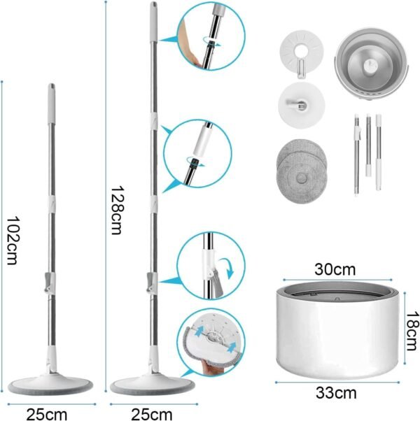 【𝟑𝟔𝟎 𝐃𝐞𝐠𝐫𝐞𝐞 𝐒𝐩𝐢𝐧 & 𝐀𝐝𝐣𝐮𝐬𝐭𝐚𝐛𝐥𝐞 𝐌𝐨𝐩 𝐏𝐨𝐥𝐞】: The spinning mop features 360 degree rotatable mop head and adjustable handle. Flexible 360 degree spin mop head makes it easier to clean sofas, beds and corners without moving the furniture. And the telescoping handle from 102cm to 128cm gives you customized comfort and control to avoid a serious sore back.