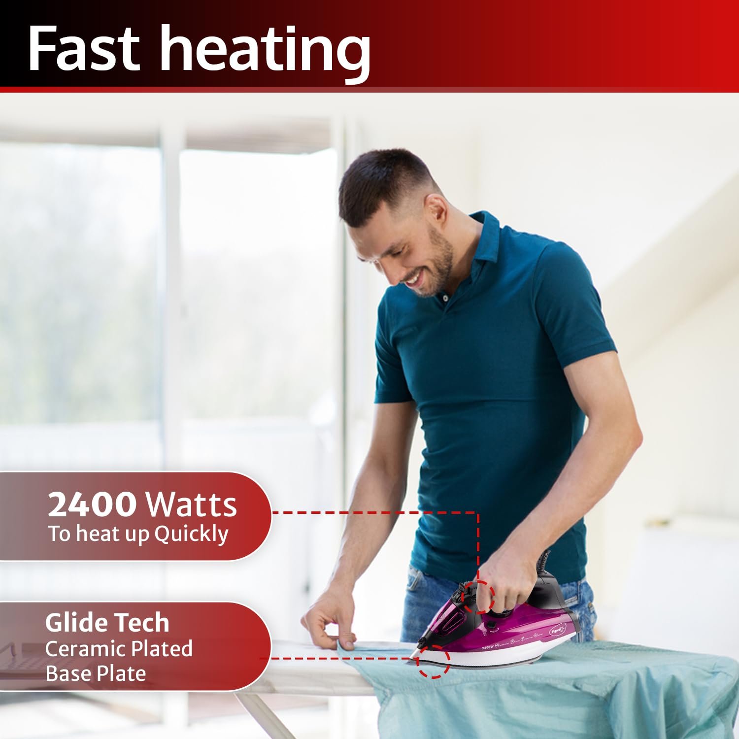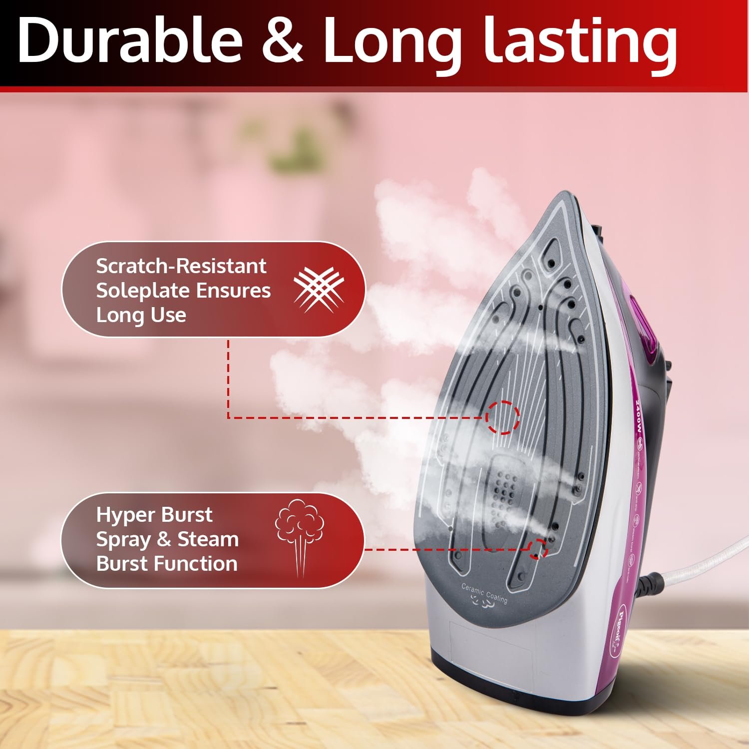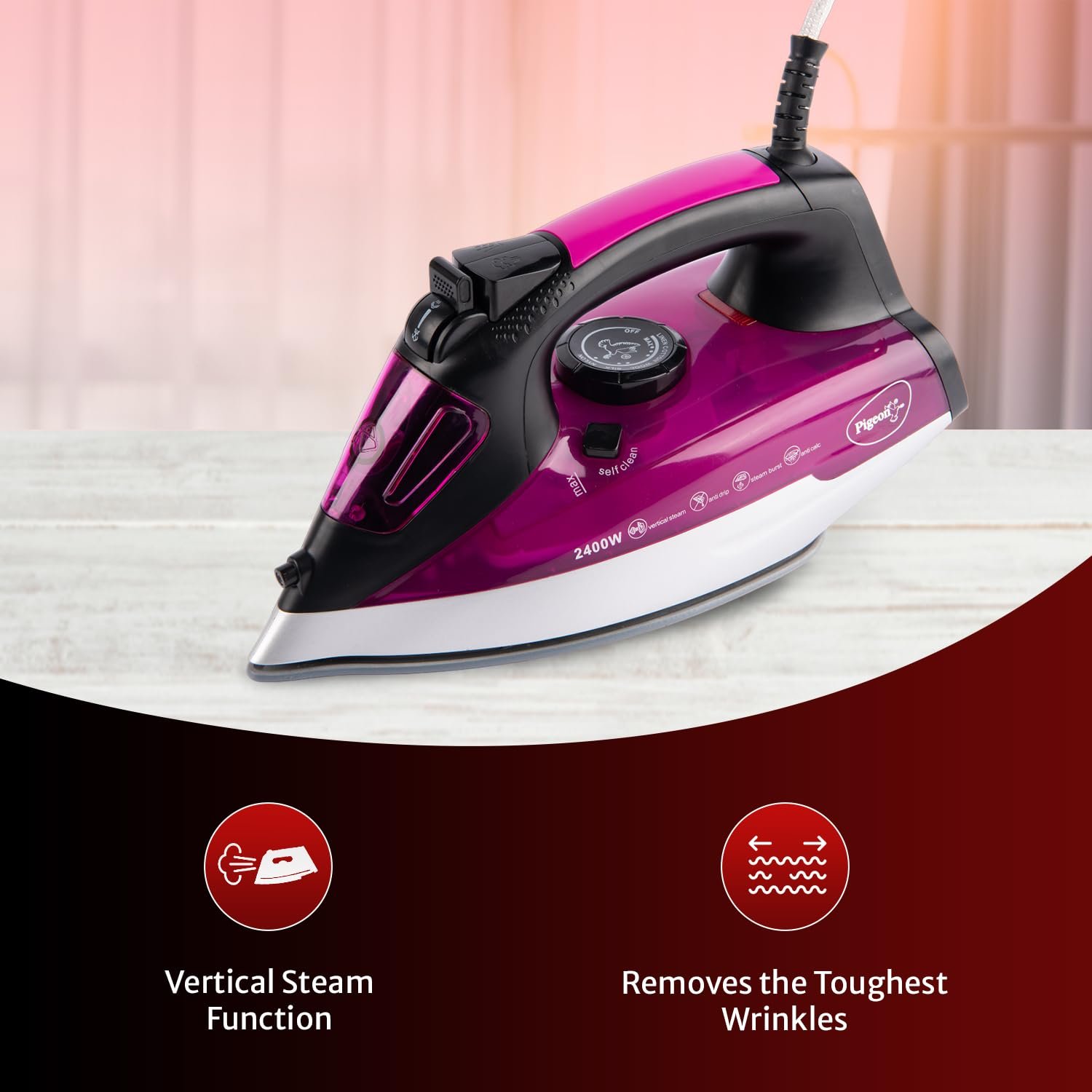Pigeon by Stovekraft Satin Steam Iron For Clothes | 2400 Watt Instant Heat with Spray (PURPLE) | Ceramic Base Plate with GlideTech | Anti Drip | HyperBurst & Vertical Steam| Self-Clean| 1.7M Long Cord