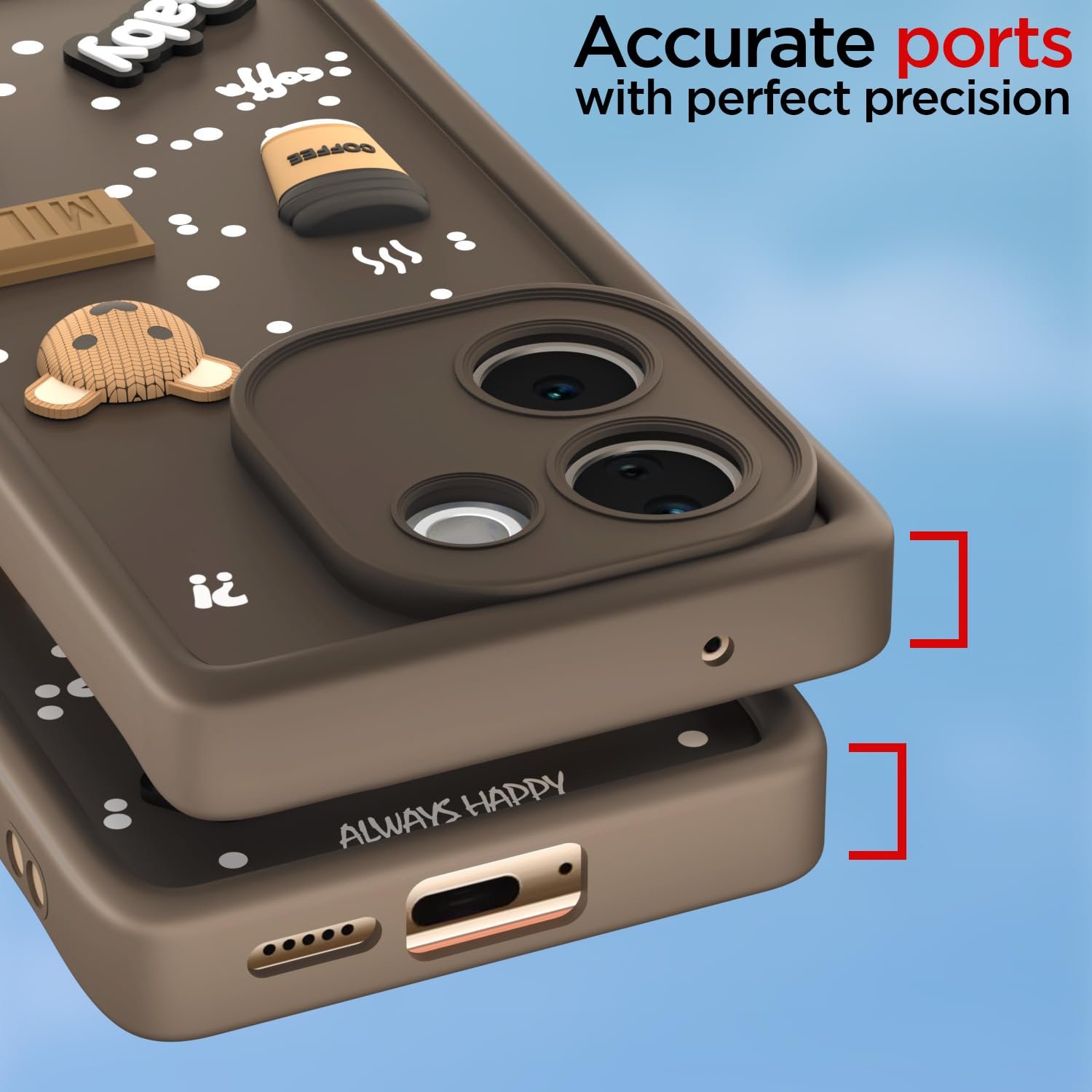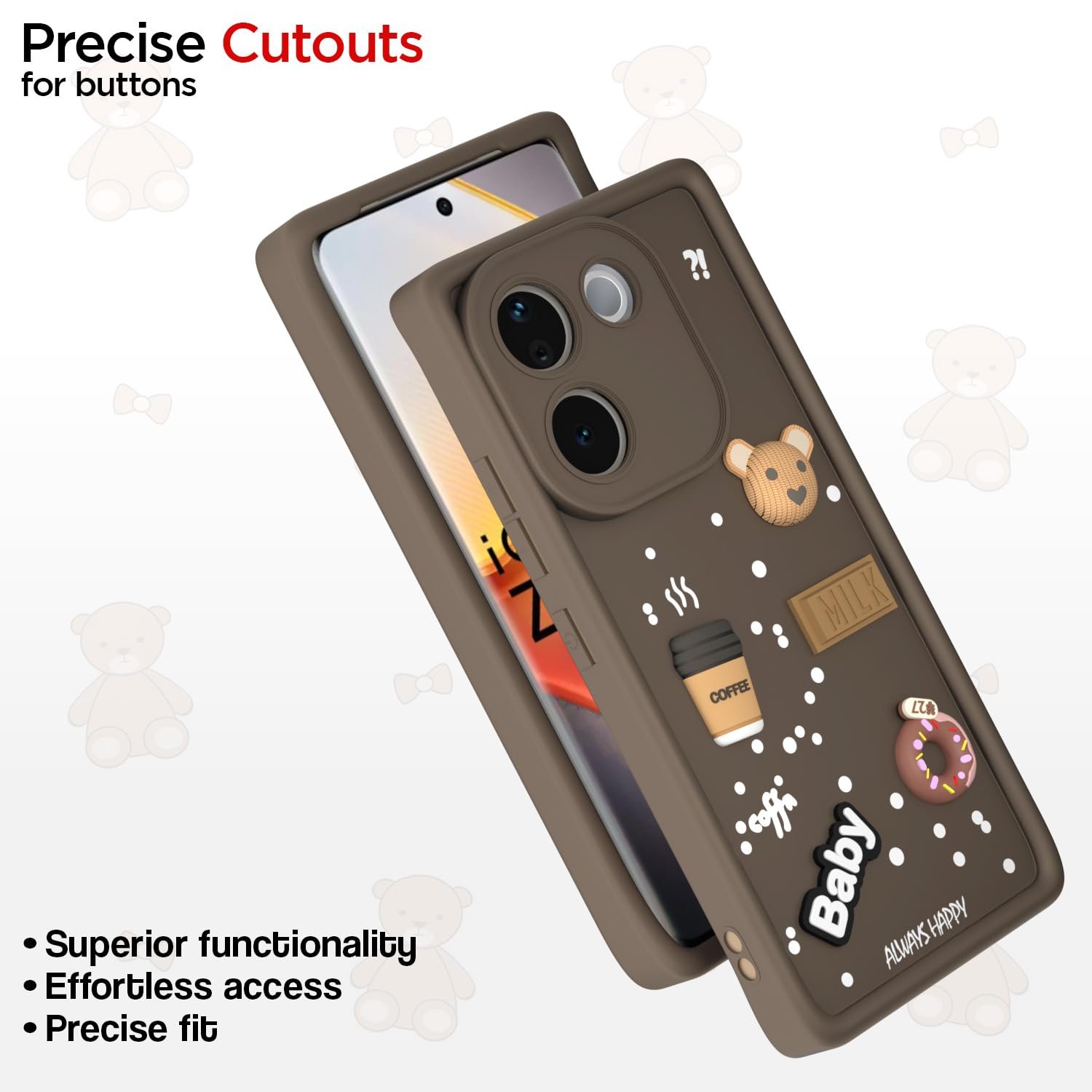 Charming 3D Cartoon Bear Design: Add the fun and playful feel to the Vivo T3 Pro 5G / iQOO Z9s Pro 5G with a distinct 3D cartoon bear design, making your mobile stand out and show off your own personal style.