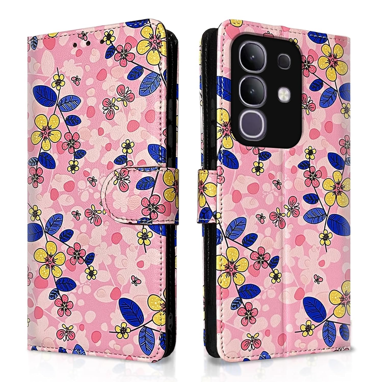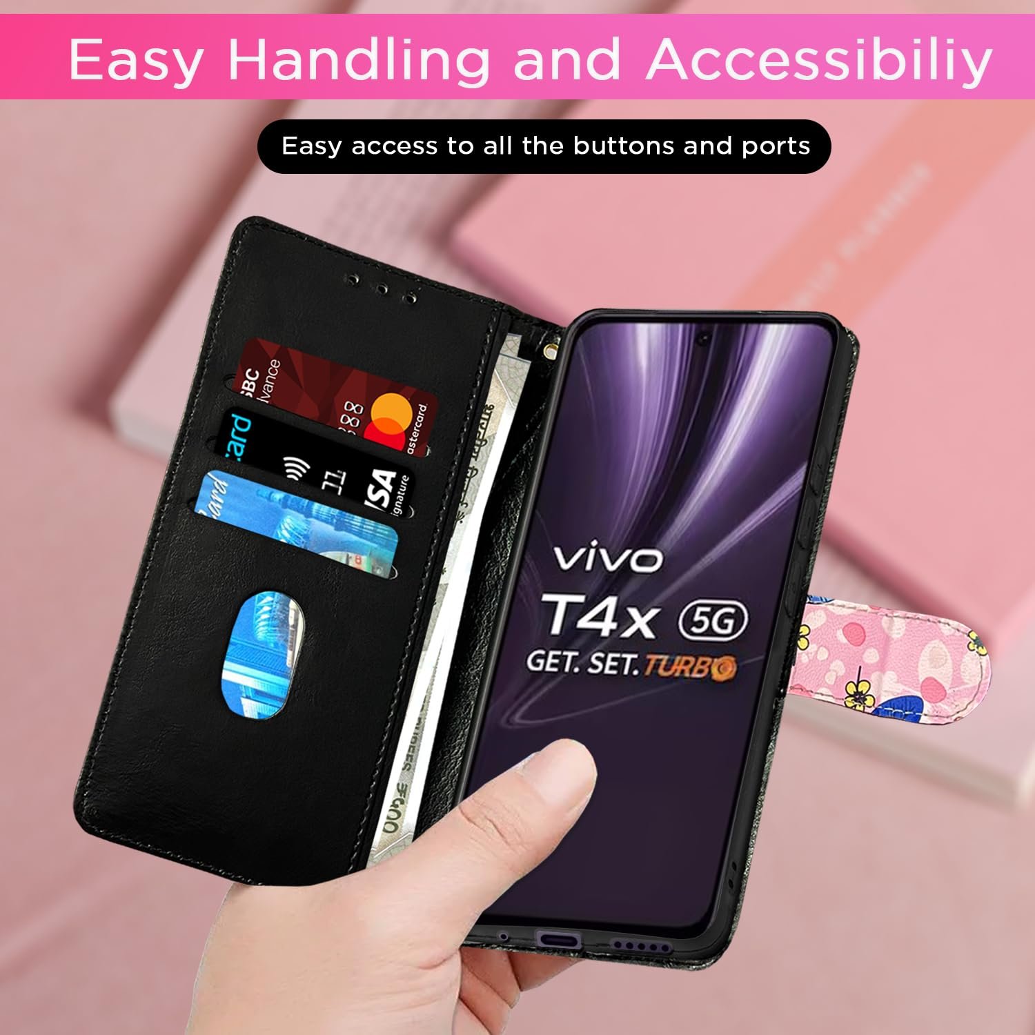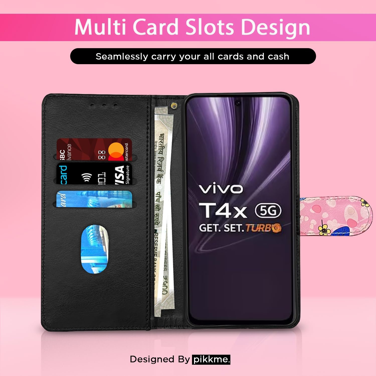 Pikkme Flip Cover for Vivo T4x 5G / iQoo Z10x 5G | Inside TPU with Card Pockets for Girls Leather Finish | Wallet Stand and Shock Proof | Complete Protection Flip Case (Pink Flower)