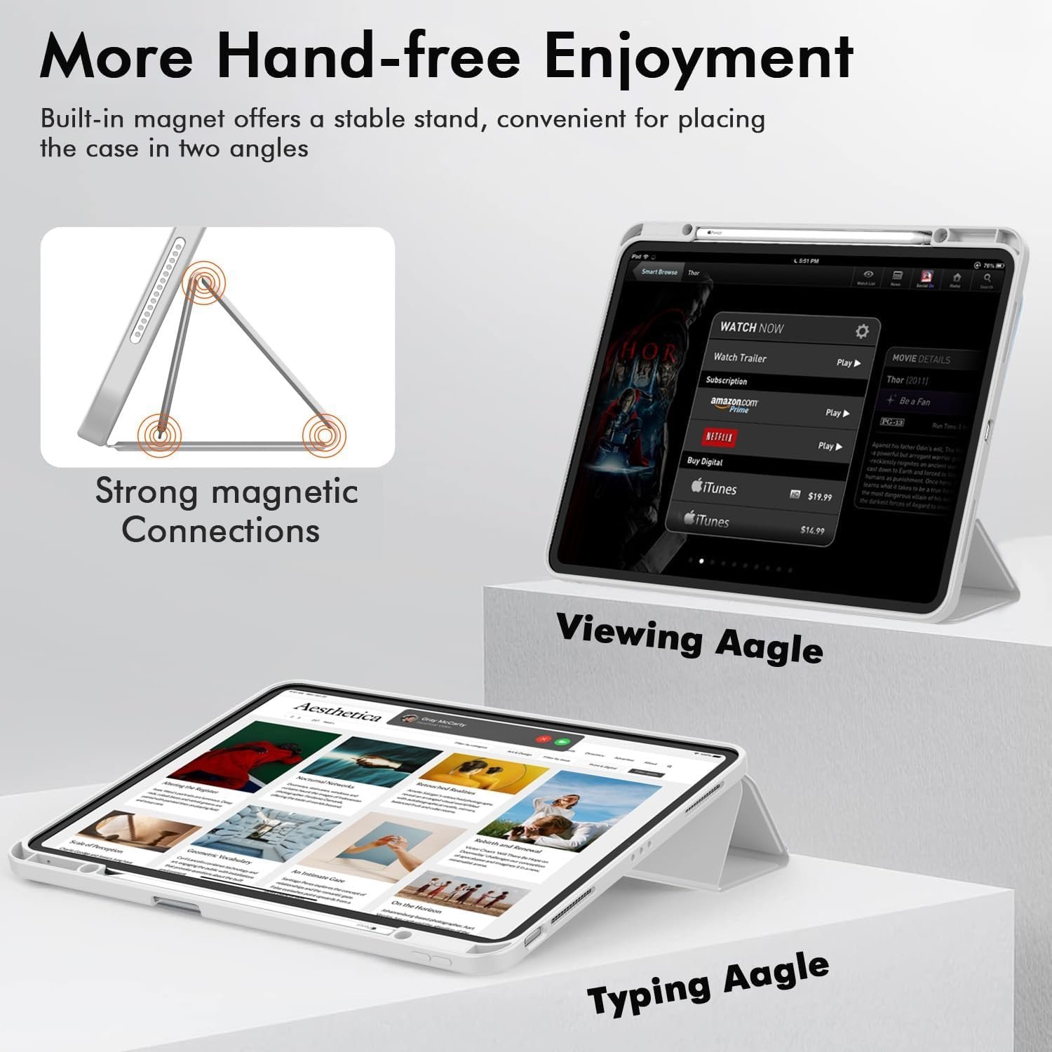 Two Viewing Angles: Trifold stand design with dual standing provide two positions for comfortable viewing or typing, you can have an excellent experience when you are relaxing or working