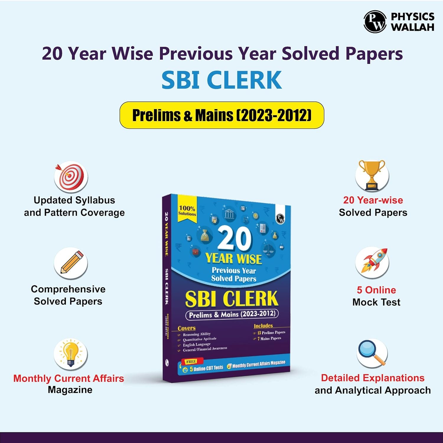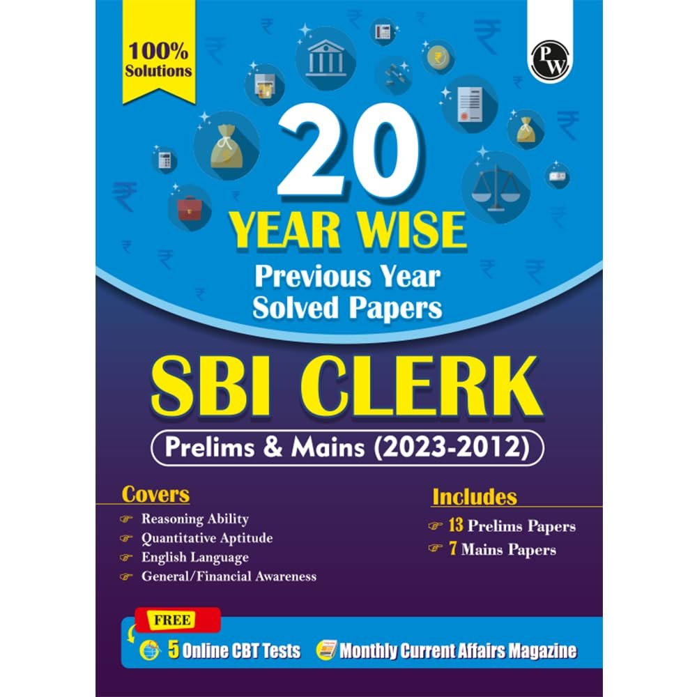 PW 20 SBI Clerk Prelims & Mains Previous Year Solved Papers (2023-2012) with 5 Online Mock Tests For 2024-25 Exam | Yearwise PYQs | Fully Solved | English Edition [Paperback] PW