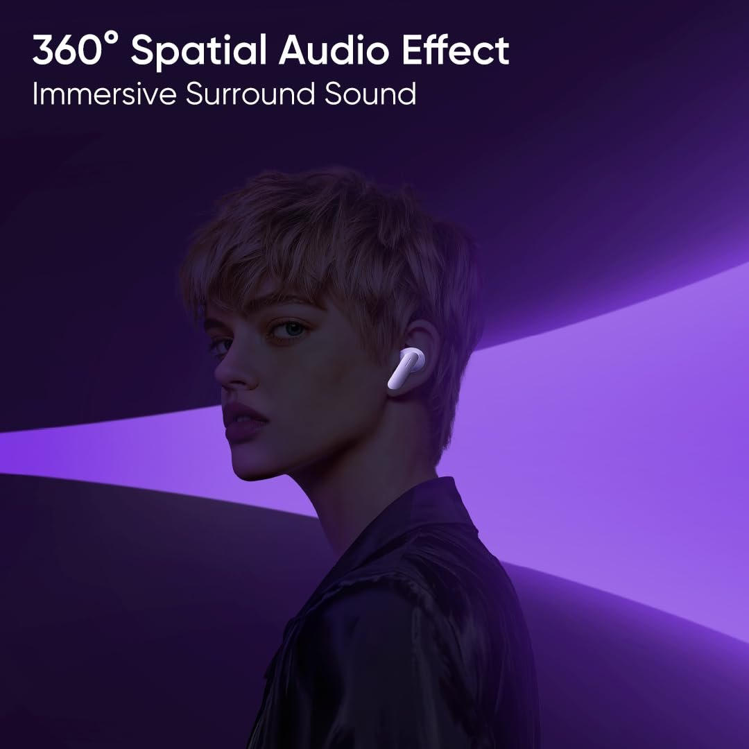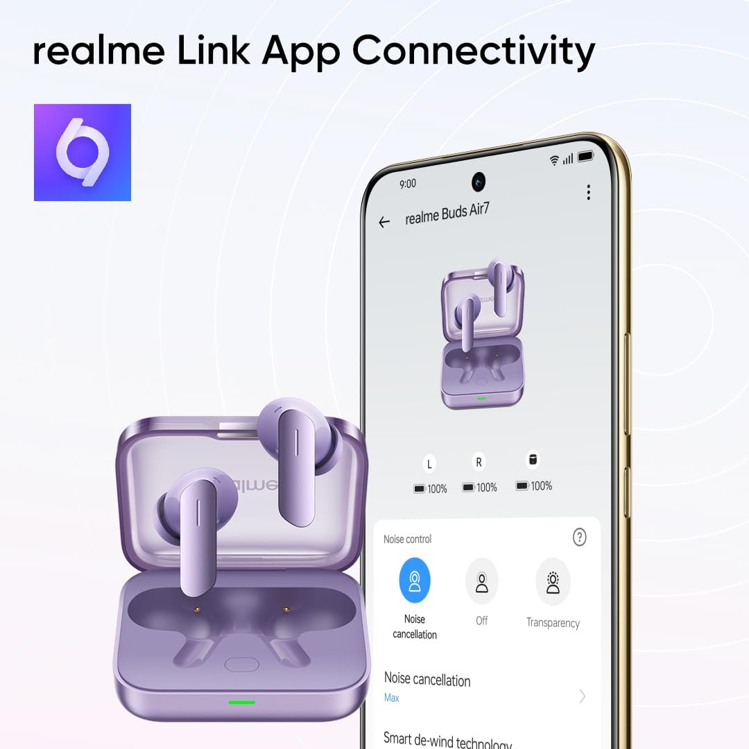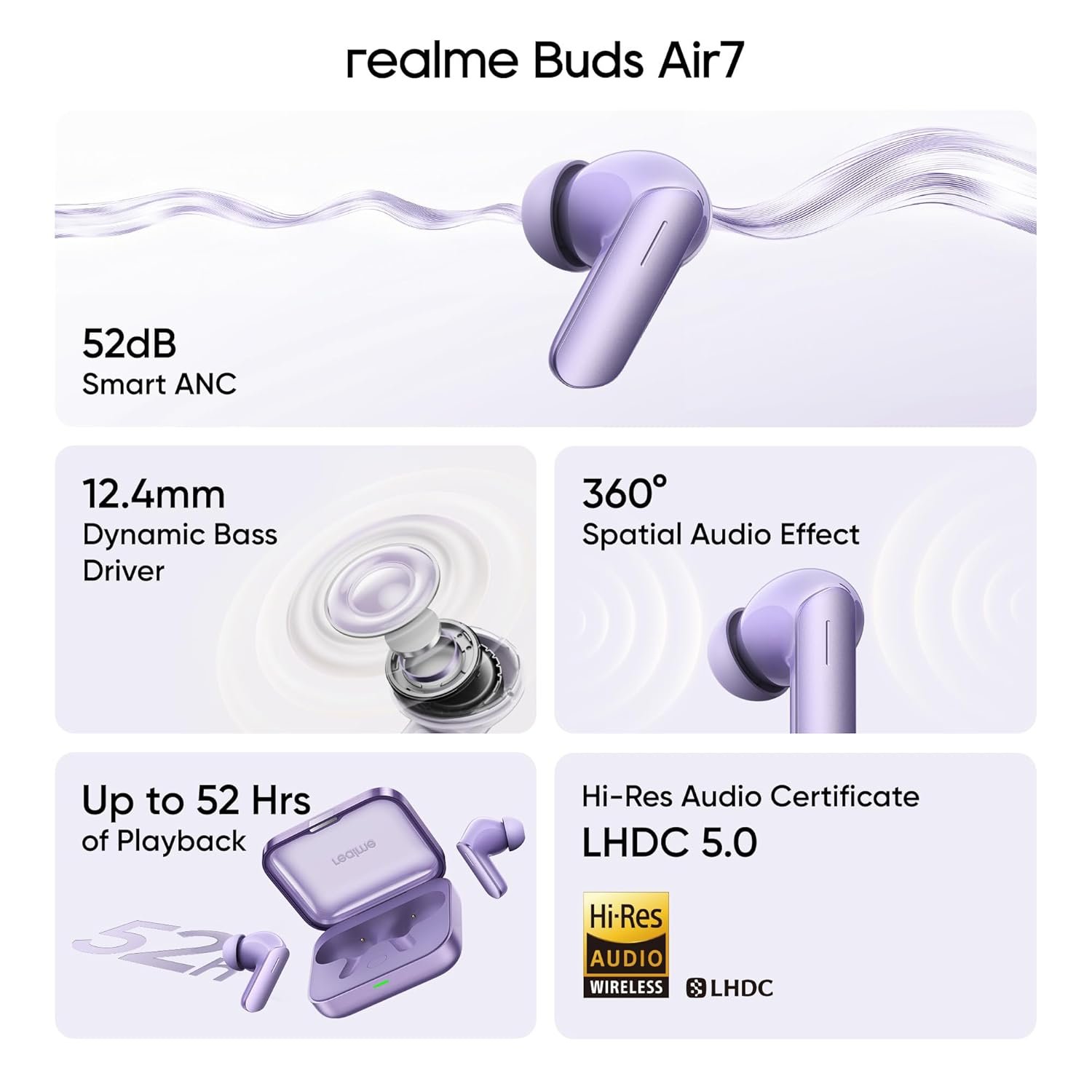realme Buds Air 7, 12.4mm Dynamic Bass Drivers,52Hrs Playtime, 52dB Hybrid ANC,6 Mic ENC, 45ms Low Latency, 360° Spatial Audio, Hi-Res LHDC, IP55 Dust & Water Resistant, BT v5.4 (Lavender Purple)