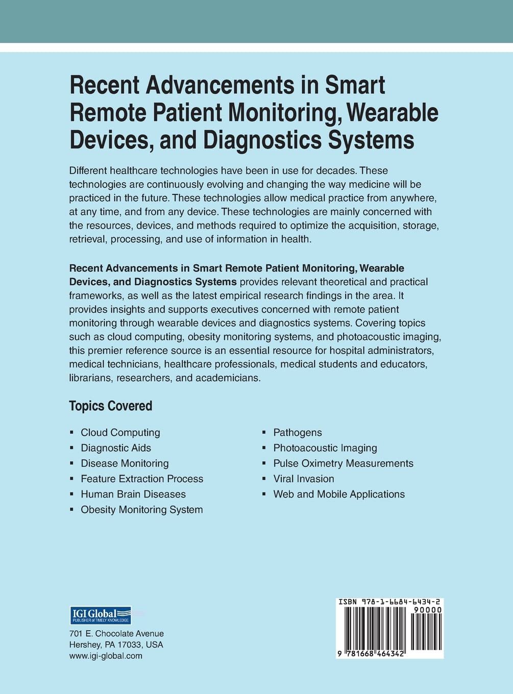 Recent Advancements in Smart Remote Patient Monitoring, Wearable Devices, and Diagnostics Systems provides relevant theoretical and practical frameworks, as well as the latest empirical research findings in the area. It provides insights and supports executives concerned with remote patient monitoring through wearable devices and diagnostics systems. Covering topics such as cloud computing, obesity monitoring systems, and photoacoustic imaging, this premier reference source is an essential resource for hospital administrators, medical technicians, healthcare professionals, medical students and educators, librarians, researchers, and academicians.