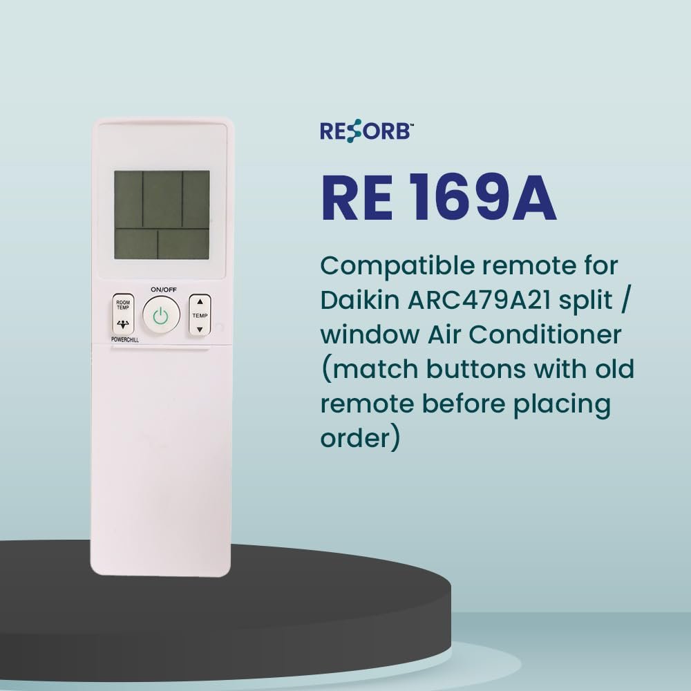 Be the first to review “RESORB® RE 169A Compatible Daikin AC Remote Original ARC479A21 Model 169a 1 1.5 2 Ton Split and Window Air Conditioner (Match Buttons with Old Remote Before Placing Order)”