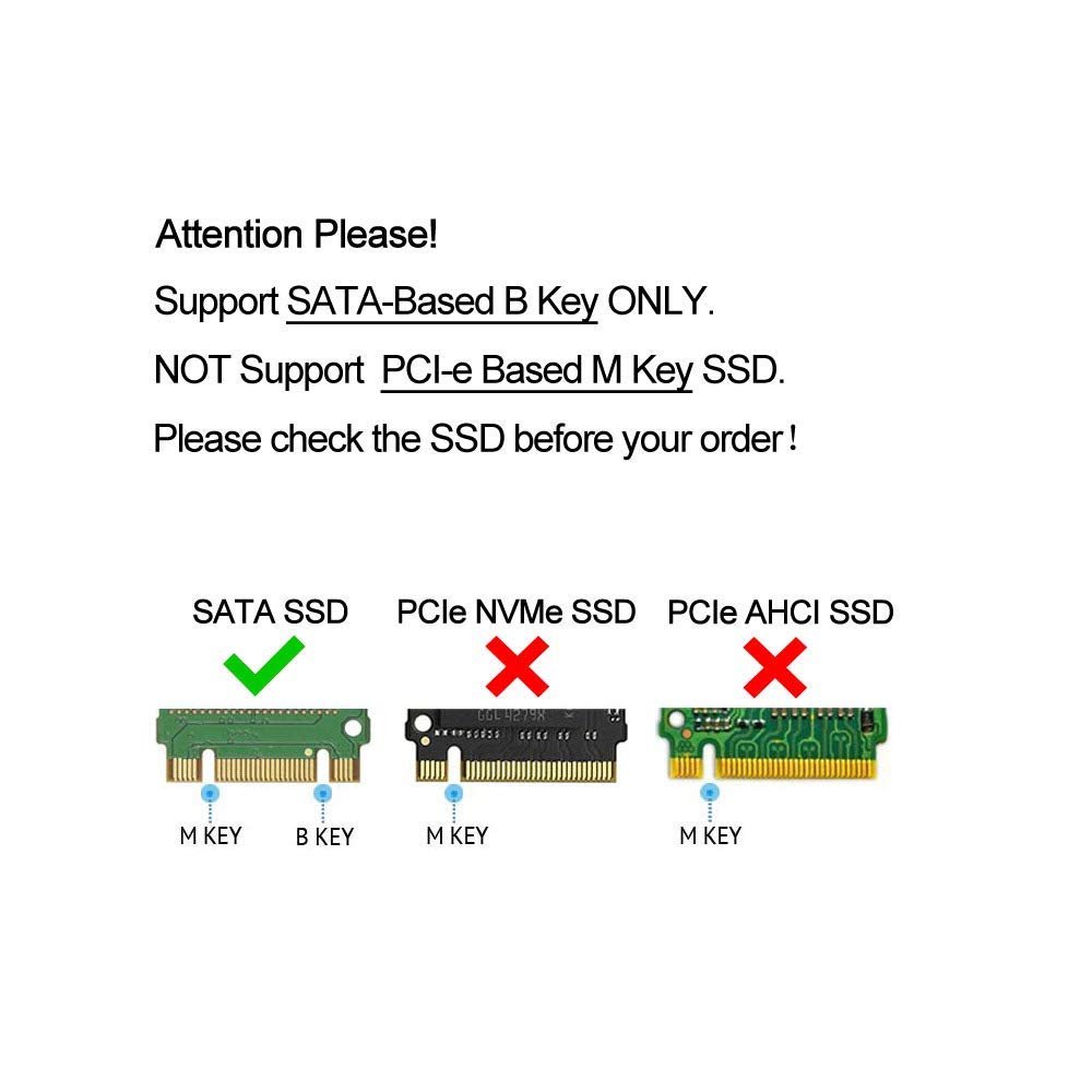 M.2(NGFF) SATA KEY B+M SSD to 2012 Makbook Air adapter card is used to allow M.2 NGFF SSD to replace SSD of 2012 Makbook Air A1465 A1466 MD224 MD223 MD231 MD232. 1. Replace the following SSD modules from 2012 Makbook Air A1465 A1466 MD224 MD223 MD231 MD232 SSD: RuhZa THNSNS064GMFP, RuhZa THNSNS128GMFP, Sams0ng MZ-EPC5120/0A2 (512GB) 2. Size is same as 2012 Air SSD: 109mmx24mm. 3. Plug and play,no need drivers . 4. The storage space is optional,support 4 sizes: type 2230,2242,2260,2280. 5. NO extra power supply required.