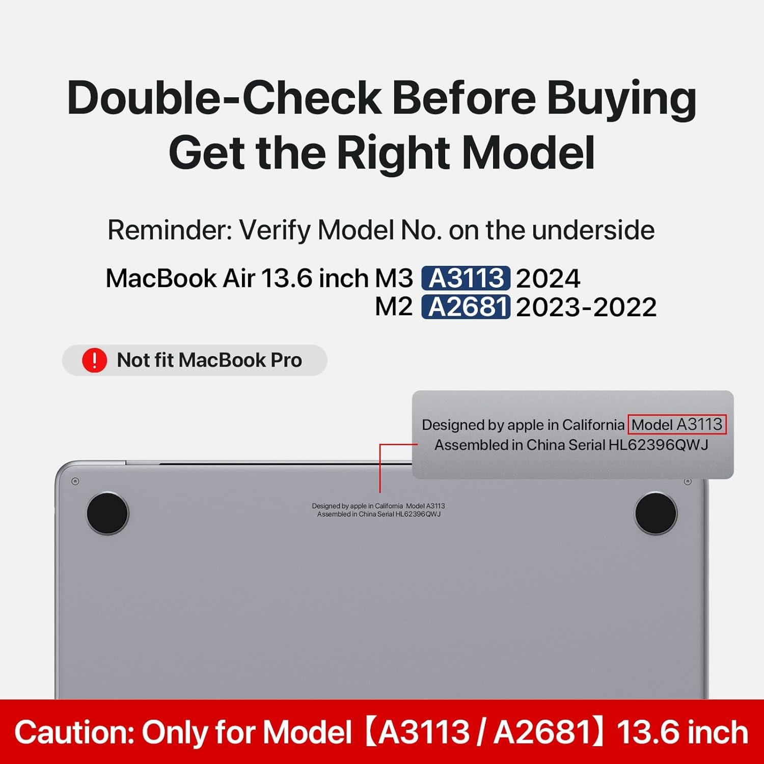 Designed ONLY to be compatible for MacBook Air 13.6-inch M4 3420 M3 A3113 M2 A2681 2025-2022 Model. Please kindly check the model number “A2681” and “A3113” and “A3420” on the bottom of the laptop before you purchase, make sure you choose the exact same model number as the listing title stated “A2681” and “A3113” and “A3420”. Please note: This case ONLY compatible with the above models, it will NOT compatible with other unmentioned models.