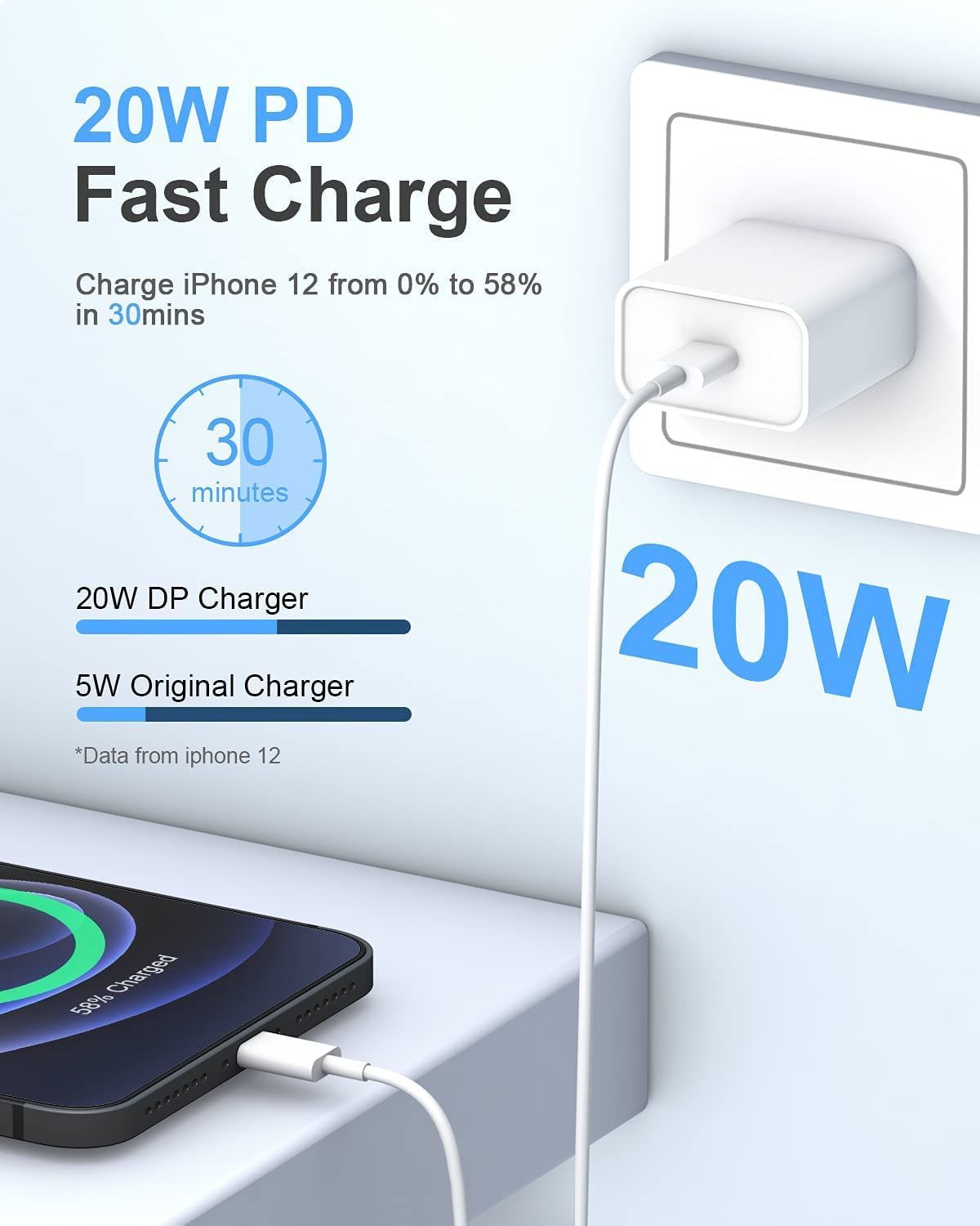 🌠 Fast Charger for iPhone: The iPhone fast charger is equipped with a 20W PD 3.0 USB C Charge port can provide a maximum of 20W output power to charge , meaning you can charge your our iPhone charger can charge your phone up to 50% in just 30 minutes, saving you over 1.5 hours!