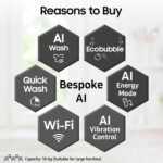 12 Wash Programs – AI Wash – senses the weight and softness of the fabric in a load and enable 25% more fabric care | Bedding – Wash heavy loads | Delicates – Gentle wash for delicate clothes | Downloaded | Downloaded Cycle: Towels, Super Clean, Clean Wash, Soak, Sari, Spin Only, Baby Care, Colors, Aqua Preserve | Energy Saving | Jeans | Normal | Option List: Delay End, Ecobubble, Intensive Wash(Long Key), AirTurbo (15min/30min), Smart Control, Power Tub Clean(Long Key), Child Lock(Double Key), Sound Off(Double Key), Smart Check(Double Key) | Quick Wash | Rinse + Spin | Tub Clean