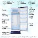 Interior Description : Fresh Food Capacity : 197 Ltr | Freezer Capacity : 18 Ltr | Total no. of compartments : 1 | Shelves : 3 | Vegetable Drawers : 1 | Shelf Type : Toughened Glass Shelves | Anti Bacterial Gasket | Base stand with Drawer for additional space for non-refrigerated food items