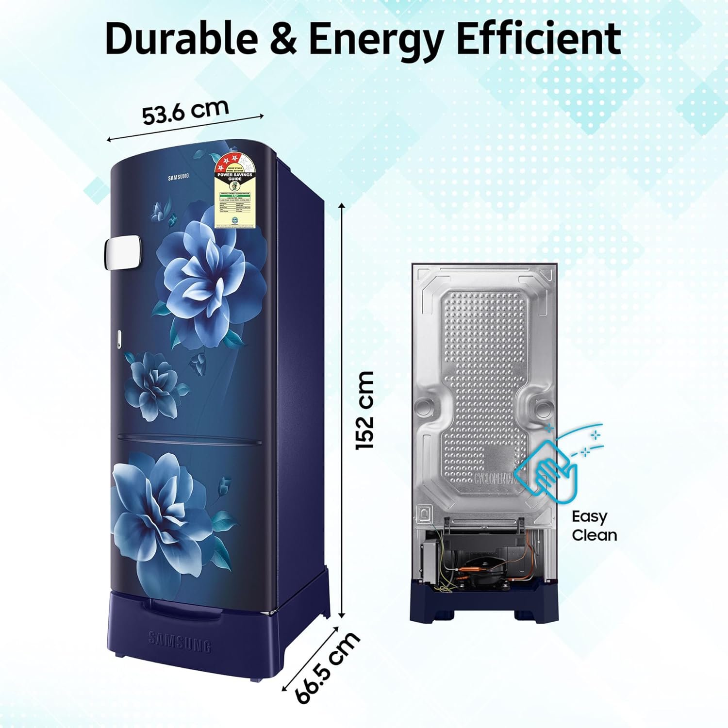Direct Cool Refrigerator: Stylish Single Door Refrigerator with Modern Camellia Blue pattern. Enjoy powerful cooling that can last longer