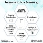 Samsung Exclusive Features : Fresh room | Grande Door Design | Stabilizer Free Operation (100v – 300v) | Smart Connect Inverter (Automatic) | Up to 15 Days of Fresh Food | Bar Handle | Lock & Key