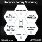 Samsung Exclusive Features : Convertible | Digital Display with Easy Touch Control | Power Cool | Fresh room | Easy Slide Shelf | All Round Cooling