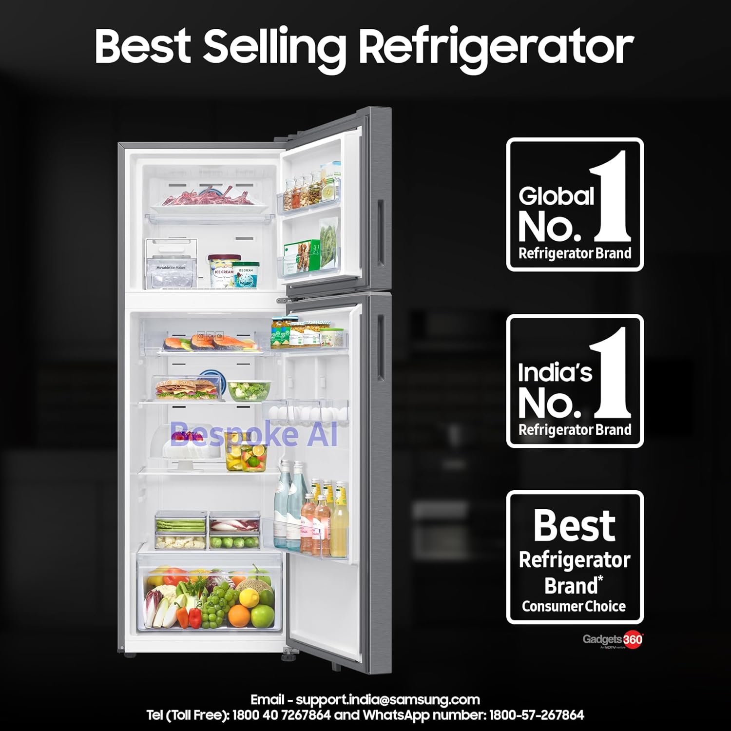 Frost Free Refrigerator with Bespoke AI: Premium Auto Defrost with powerful cooling and long lasting freshness. Powered with AI, get additional 10% Energy Savings with AI Energy Mode. Manage your flexible storage needs with Convertible 5in1 technology : |Normal Mode|Extra Fridge Mode|Seasonal Mode|Vacation Mode|Home Alone Mode