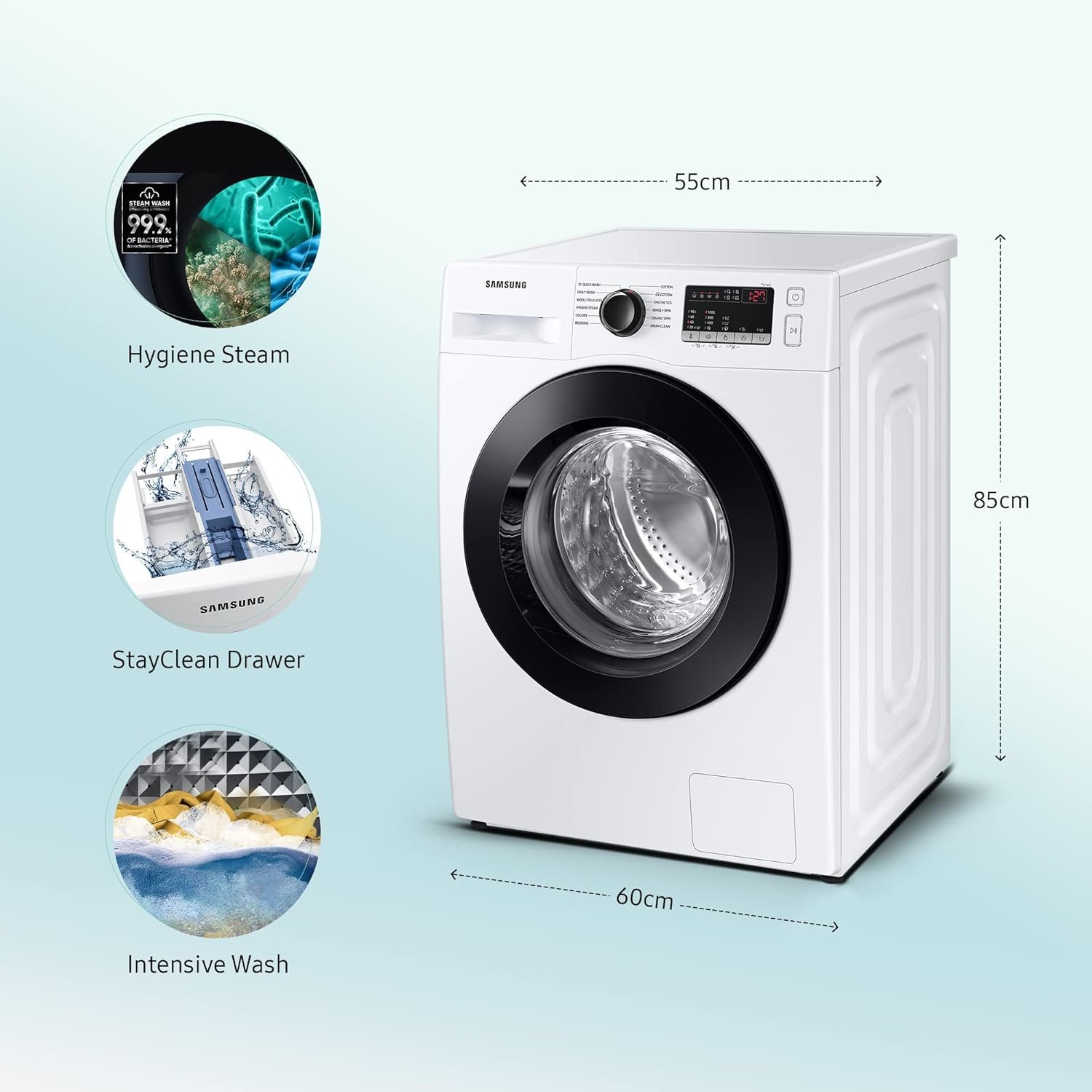 Wash Programs: 12 No.of Programs – [15′ Quick Wash, Bedding, Cotton, Colors, Daily Wash, Drain/Spin, Drum Clean, E Cotton, Hygiene Steam, Rinse + Spin, Synthetics, Wool/Delicates]
