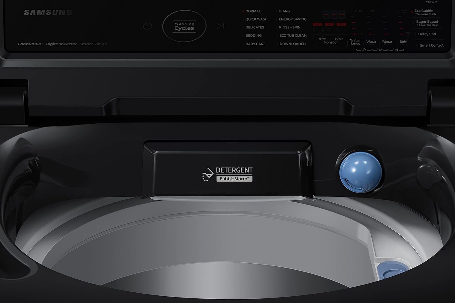Wash Programs: 10 Wash Programs – Quick Wash, Baby Care, Bedding, Delicates, Eco Tub Clean, Energy Saving, Jeans, Normal, Rinse + Spin, Bubble Storm, Intensive Wash, Super Speed, Power Tub Clean, Delay End, Smart Control