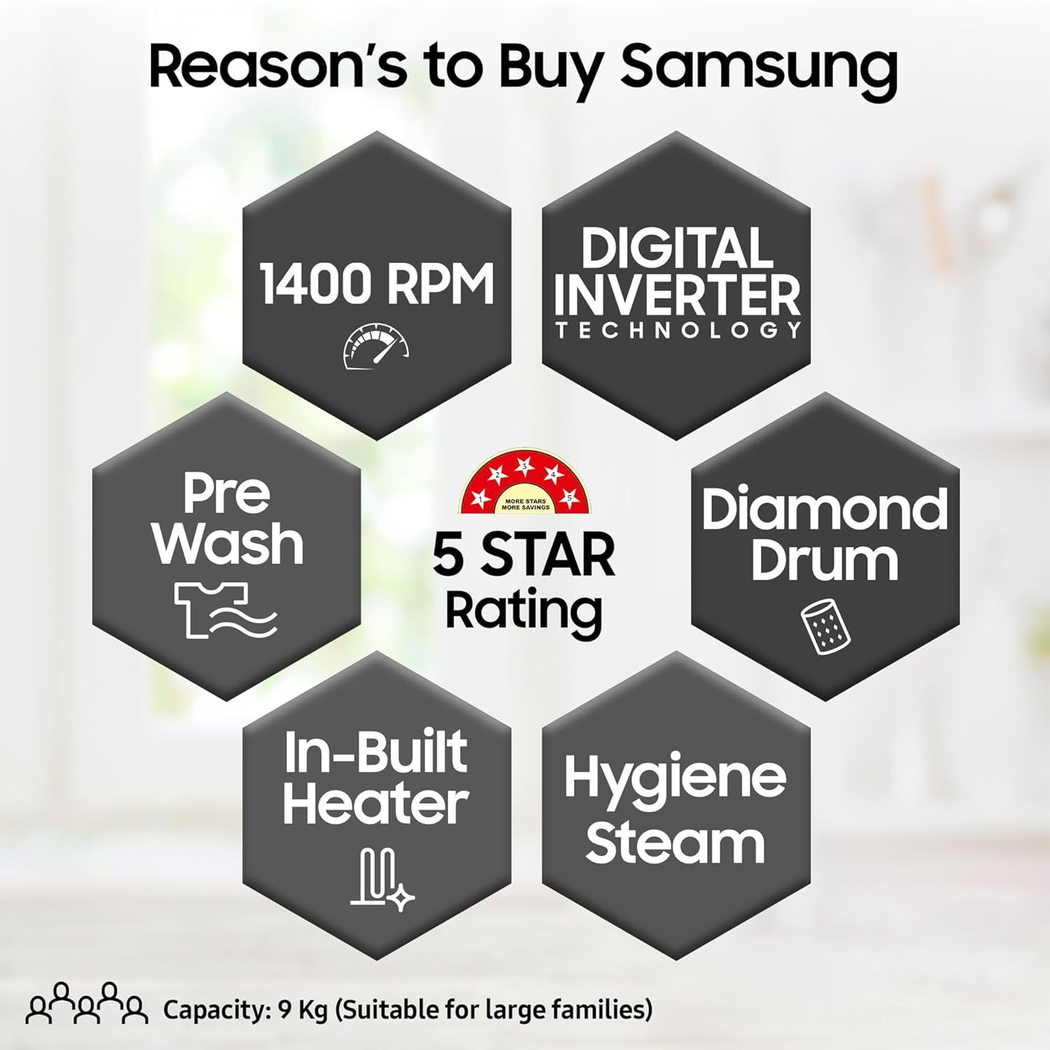 Samsung 9 kg, Hygiene Steam with Inbuilt Heater, Digital Inverter, Fully-Automatic Front Load Washing Machine (WW90T4040CB1TL, Black)