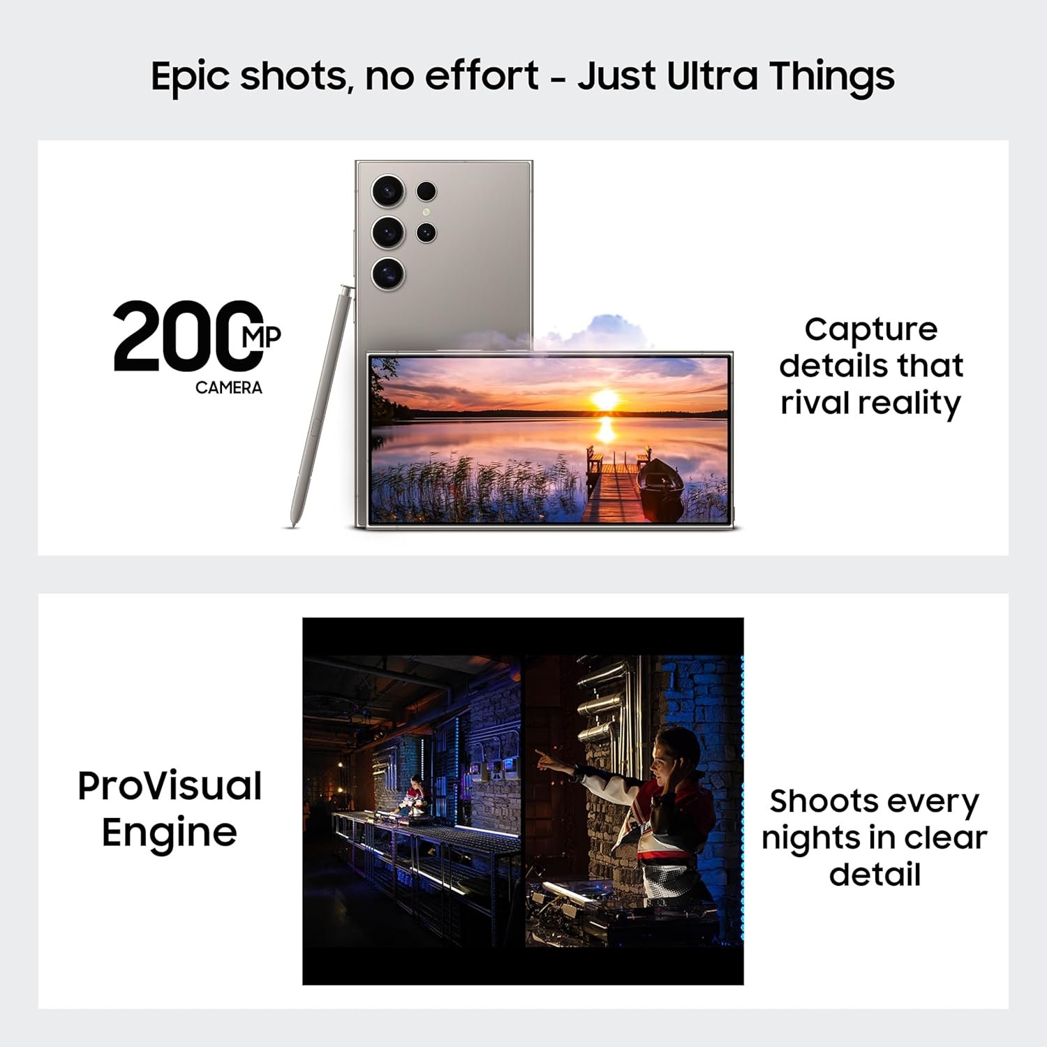 Epic Camera – With the most megapixels on a Galaxy smartphone ever (200MP) and AI processing, Galaxy S24 Ultra sets the industry standard for image quality every time you hit the shutter. Also, the new ProVisual engine recognizes objects, improves color tone, reduces noise and brings out every detail.